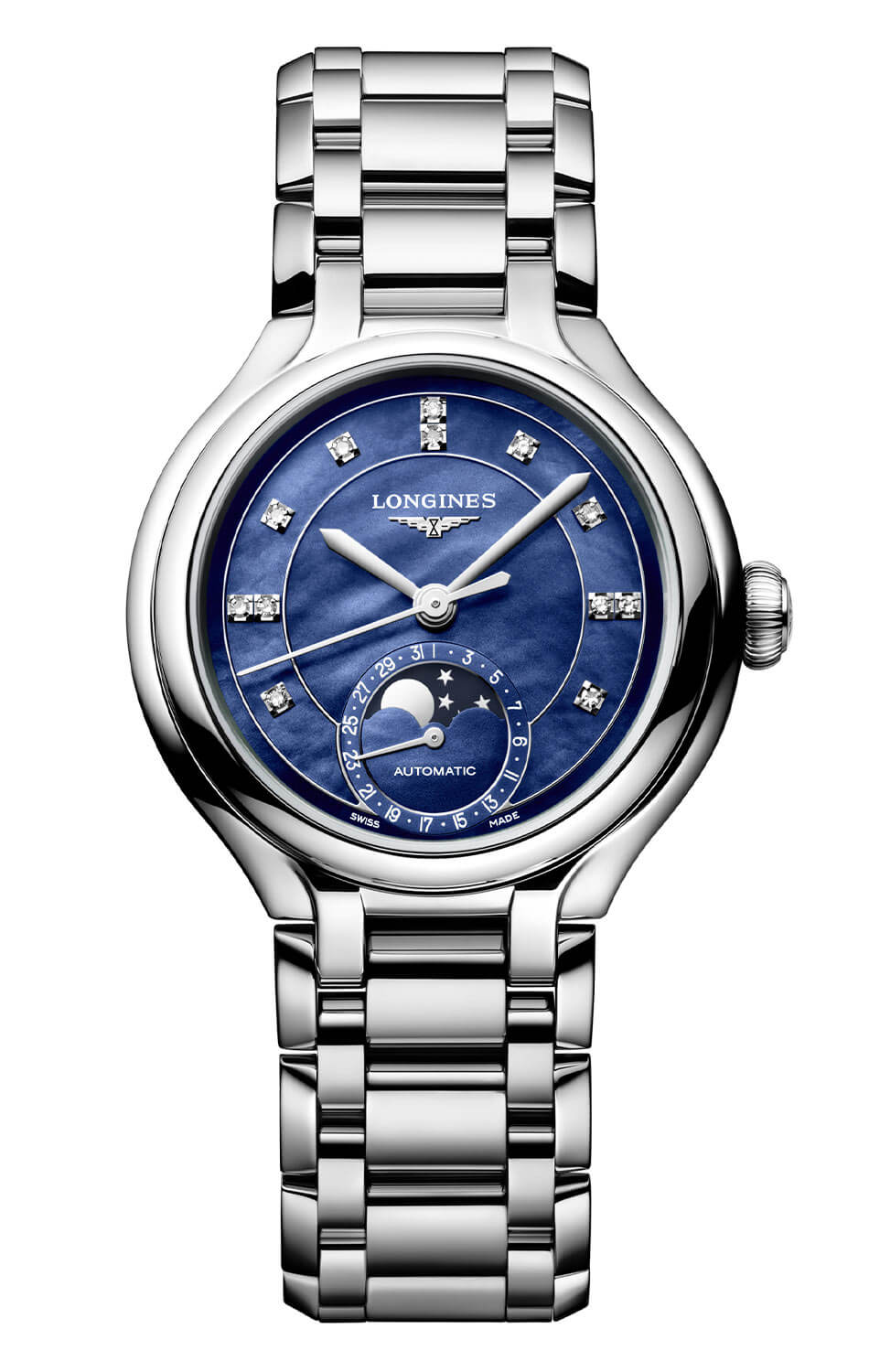 Dámské automatické hodinky Longines PrimaLuna Moonphase L8.126.4.97.6 jsou určeny ženám, které si cení jemné elegance a nadčasového stylu. Harmonická linie pouzdra o průměru 34 mm je doplněna zářivým ocelovým náramkem, který plynule navazuje na pouzdro a vytváří vyváženou kompozici s šperkařským nádechem. Perleťový modrý ciferník s přirozenými diamantovými indexy podtrhuje výjimečnost modelu a činí jej ideálním jak pro každodenní nošení, tak pro slavnostní příležitosti.