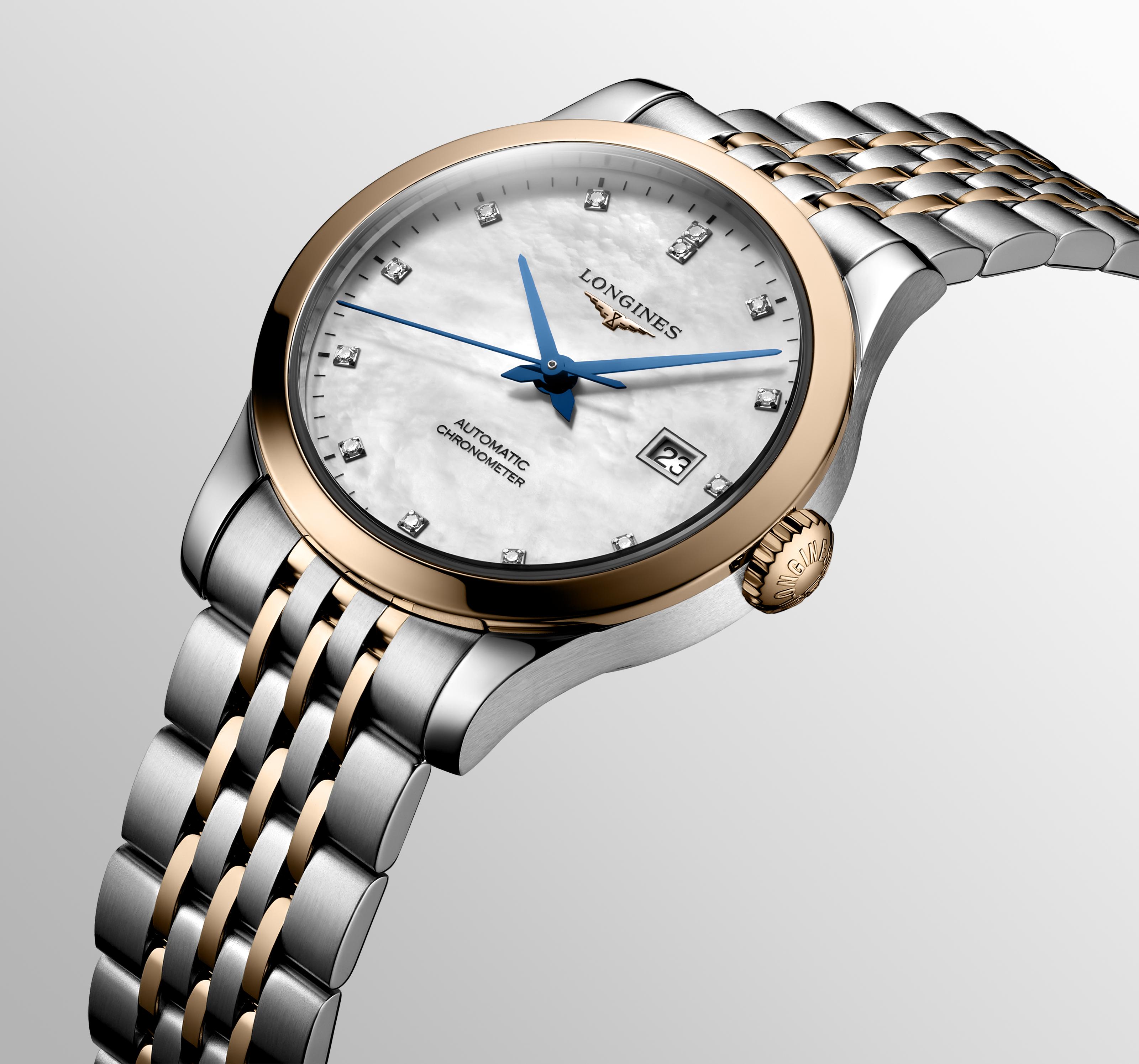 Dámské hodinky Longines Record Lady L2.321.5.87.7 . S modelem Record Longines vyjadřuje podstatu značky, spojuje nadčasovou eleganci s dokonalostí. To jsou hodnoty, které kolekci jistě dostanou na úroveň hodnou budoucích úspěchů značky. Model je mostem mezi tradicí a inovací. Rozhodně klasický styl je charakteristickým znakem hodinářství na nejvyšší úrovni od Longines. Elegantní pouzdro a náramek z nerezové oceli a růžového zlata.