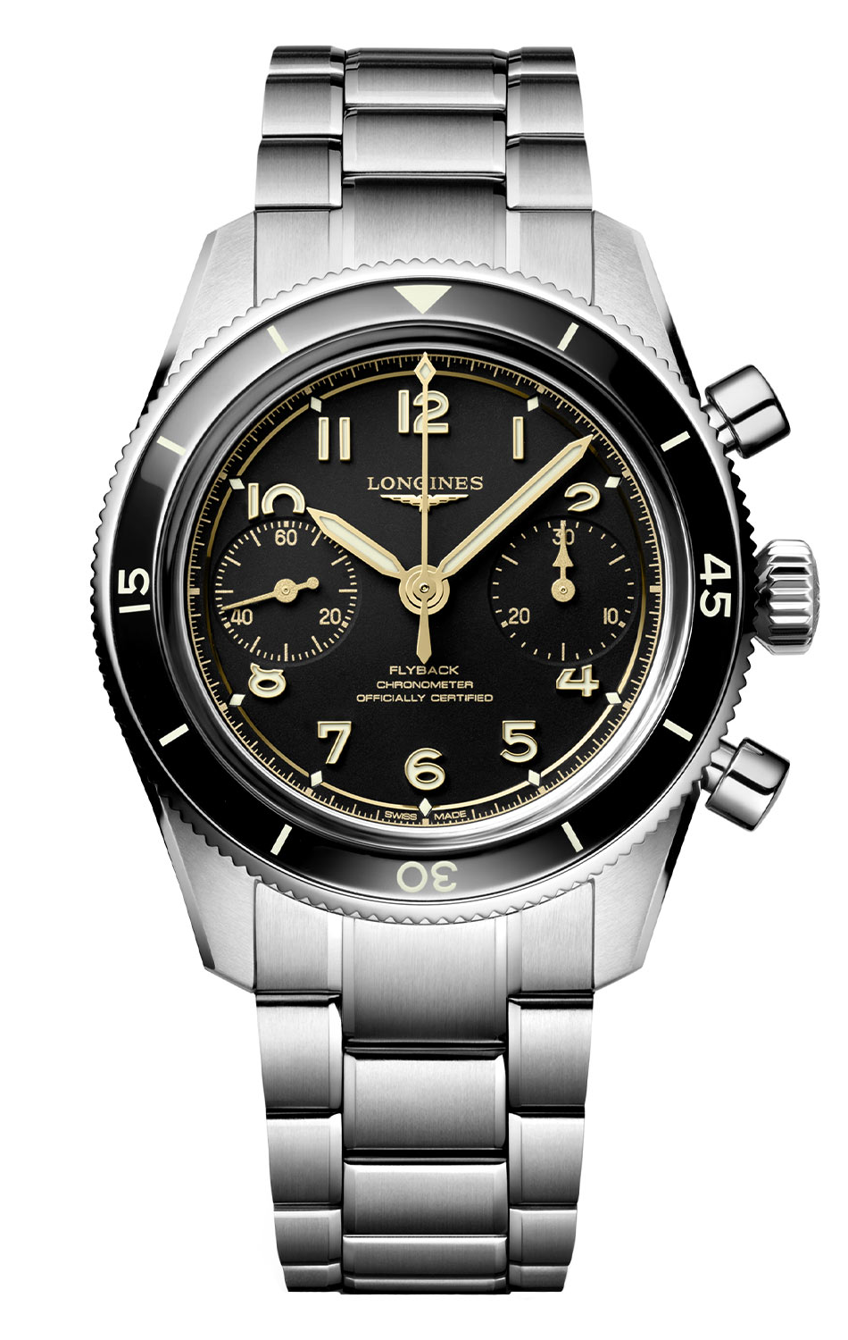 Černý matný ciferník zachovává minimalistické a funkční uspořádání typické pro klasické letecké chronografy. Zlaté arabské číslice, štíhlé ručky a dva pomocné čítače — 30minutový a 60sekundový — tvoří přehledný celek zaměřený na rychlý a přesný odečet údajů. Funkce flyback umožňuje okamžité spuštění nového měření bez zastavení a nulování ručky, což činí tento model nástrojem nejen efektním, ale i efektivním. Švýcarský strojek L792 pracující pod ciferníkem je jednotkou vysoké třídy, vyvinutou speciálně pro tuto referenci Longines.