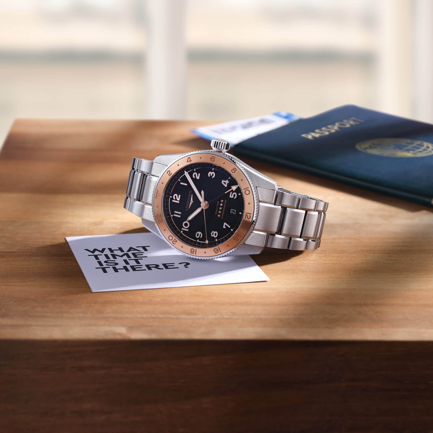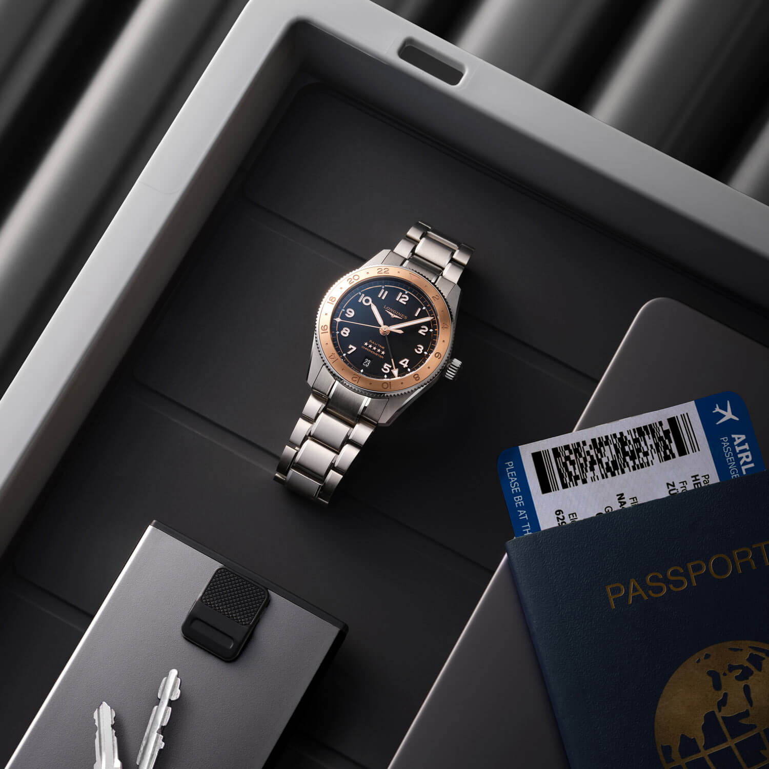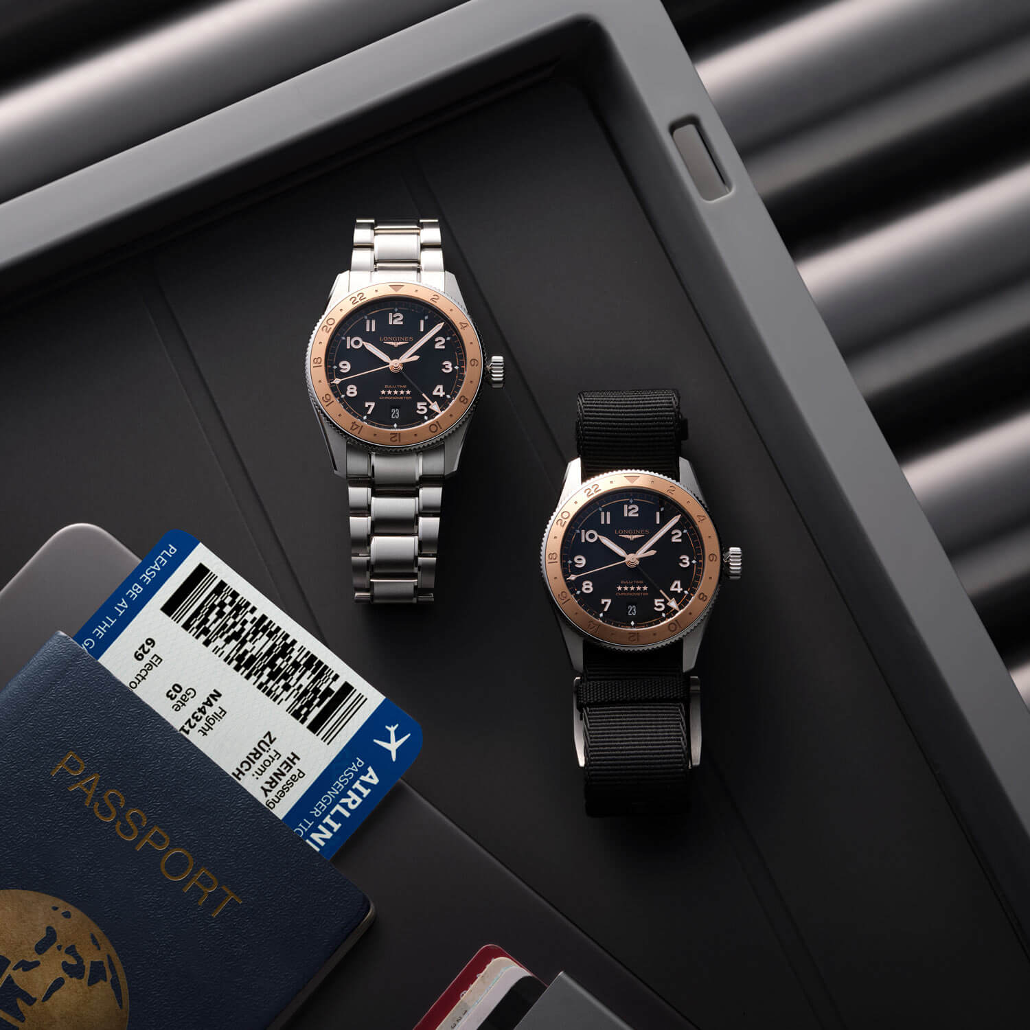Kompaktní pouzdro o průměru 39 mm je vyrobeno z ušlechtilé oceli a uzavřeno šroubovacím dýnkem s rytinou zeměkoule a okřídlených přesýpacích hodin – poctou průzkumnému duchu značky. Obousměrná luneta s vložkou z 18karátového růžového zlata dodává hodinkám prestiž, zatímco 24hodinová stupnice umožňuje rychlý odečet druhého časového pásma. Integrovaný ocelový náramek ladně navazuje na tvar pouzdra a mírně vypouklé safírové sklíčko s dvojitou antireflexní vrstvou zajišťuje bezchybnou čitelnost v jakýchkoli podmínkách – od kabiny letadla až po slunné letiště. Tento model je dodáván také s náhradním NATO řemínkem, díky kterému lze hodinky snadno přizpůsobit osobnímu stylu.