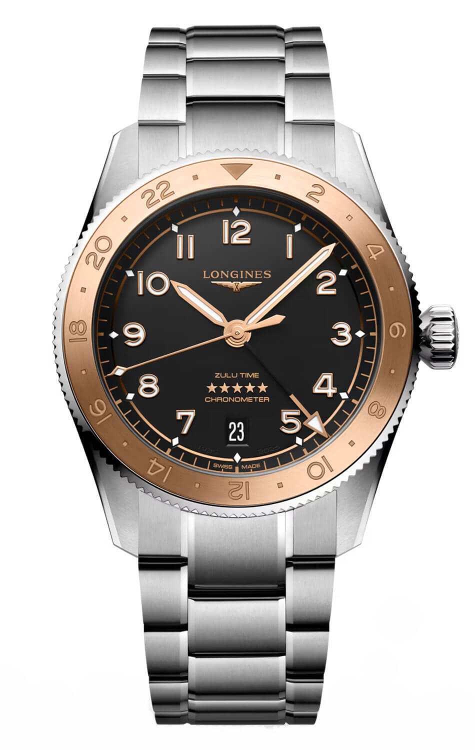Číselník v hlubokém matném odstínu černé byl navržen ve stylu leteckého funkcionalismu – maximální přehlednost bez zbytečných ozdob. Výrazné arabské číslice a diamantové indexy jsou opatřeny vrstvou Super-LumiNova®, která zajišťuje čitelnost i v noci. Charakteristická pozlacená GMT ručička ve tvaru hrotu a pět hvězd na číselníku jsou jemnými odkazy na tradici značky a její špičkovou hodinářskou preciznost. O přesný chod se stará švýcarský automatický kalibr L844.4 s rezervou chodu až 72 hodin a silikonovým vláskem setrvačky – lehkým, odolným a přesným bez ohledu na polohu zápěstí. Použitý strojek je certifikovaný institutem COSC jako Chronometer, což zaručuje mimořádnou přesnost za všech podmínek a v jakékoli pozici, ve které se hodinky Longines právě nacházejí.