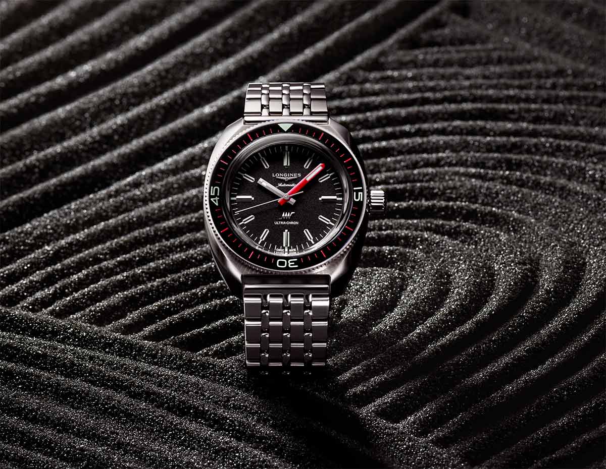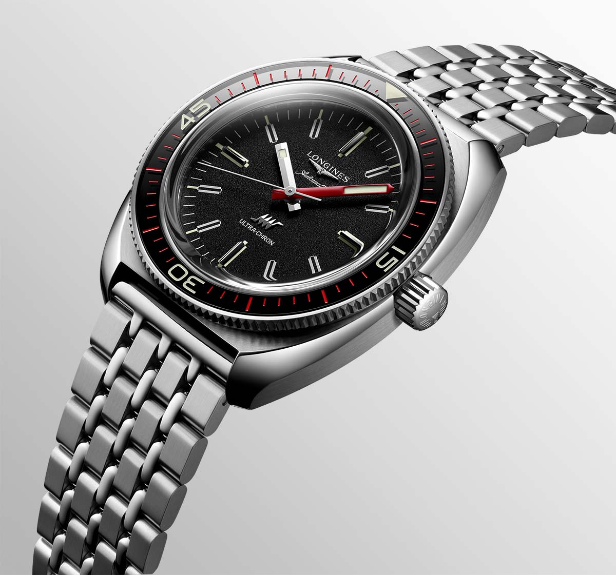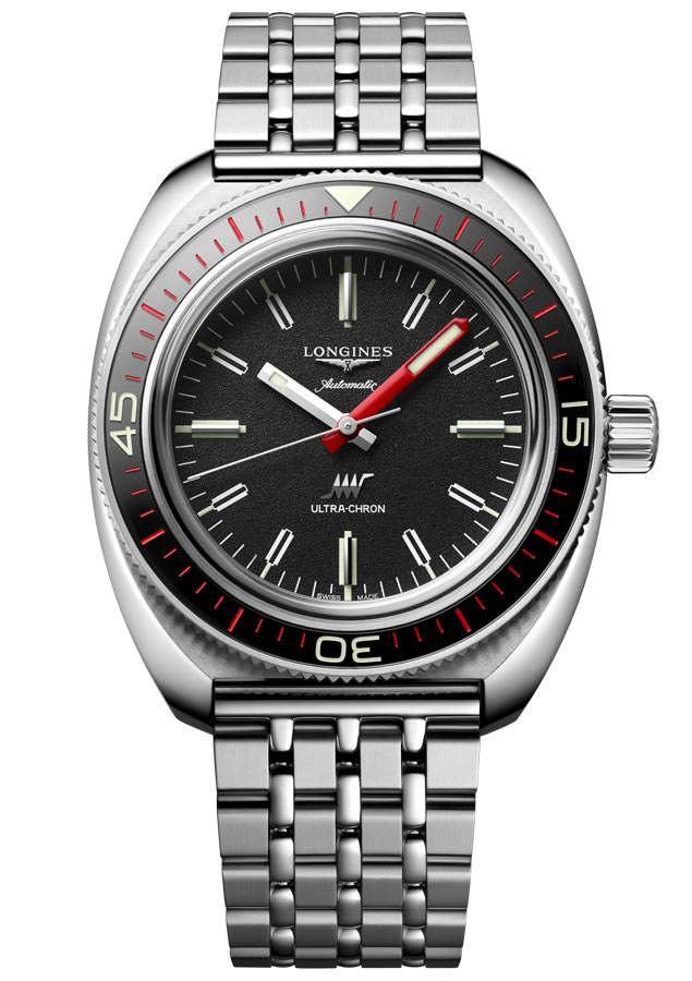 Design nových hodinek Longines Ultra-Chron a jejich profesionální diverské funkce jsou převzaty z modelu divere z roku 1968. Hodinky mají jednosměrně otočnou lunetu se safírovou vložkou s luminiscenčními detaily, šroubovací zadní část pouzdra a šroubovací korunku. Toto dílo nabízí vynikající čitelnost a je voděodolné do 30 barů (300 metrů) .