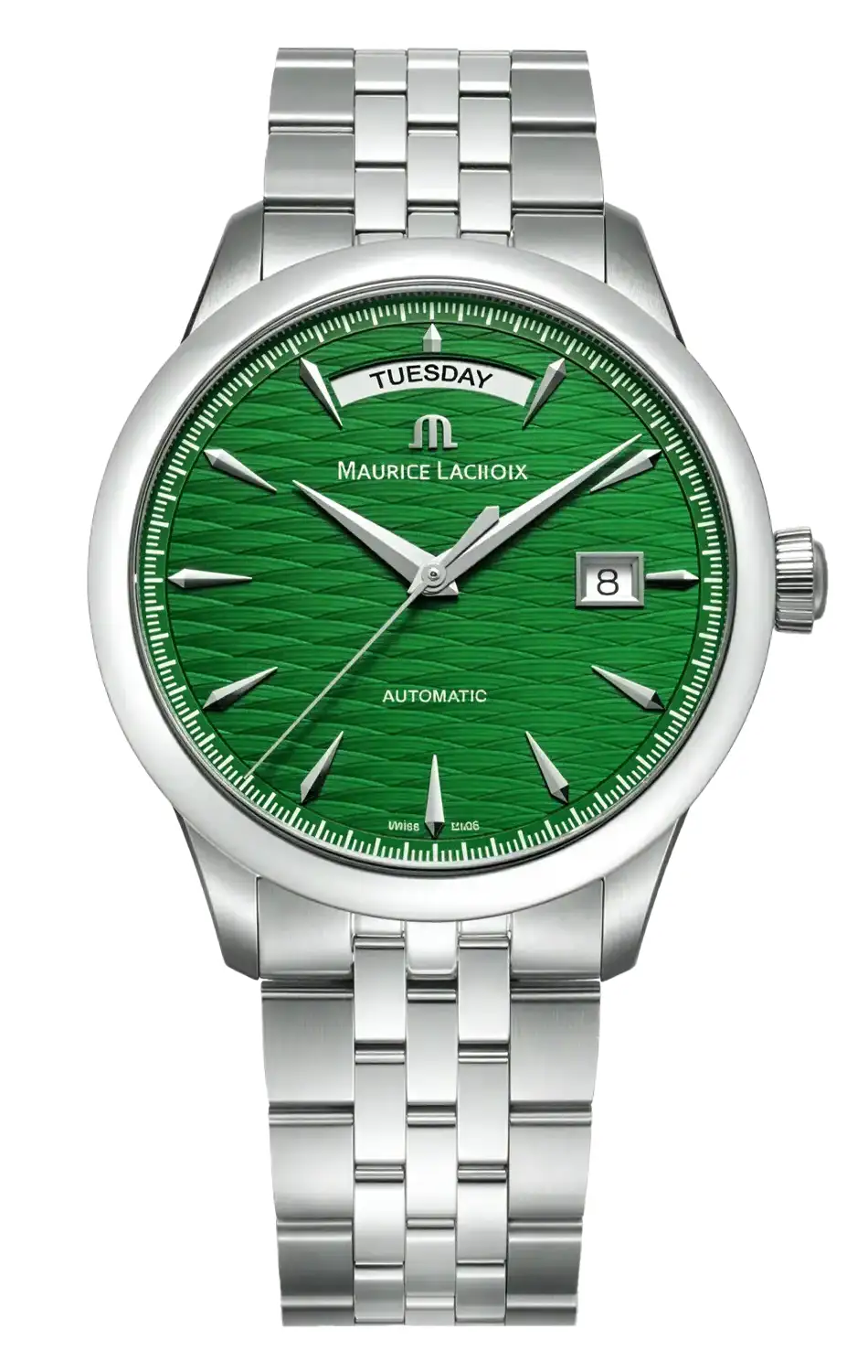 Vzor vlnícího se povrchu dodává ciferníku hloubku a efekt jemného pohybu, zejména v kombinaci s leštěnými indexy a dynamickými ručkami, které krásně odrážejí světlo. Den v týdnu je zvýrazněn v podobě širokého okénka pod dvanáctou hodinou a datumovka v klasické pozici třetí hodiny zajišťuje funkčnost bez narušení kompozice. Prezentovaný model je automatické hodinky Maurice Lacroix 1975 756058-SS002-630-1, které díky své jednotné estetice a propracování nejmenších detailů představují uváženou volbu pro osoby hledající klasiku s hloubkou.
