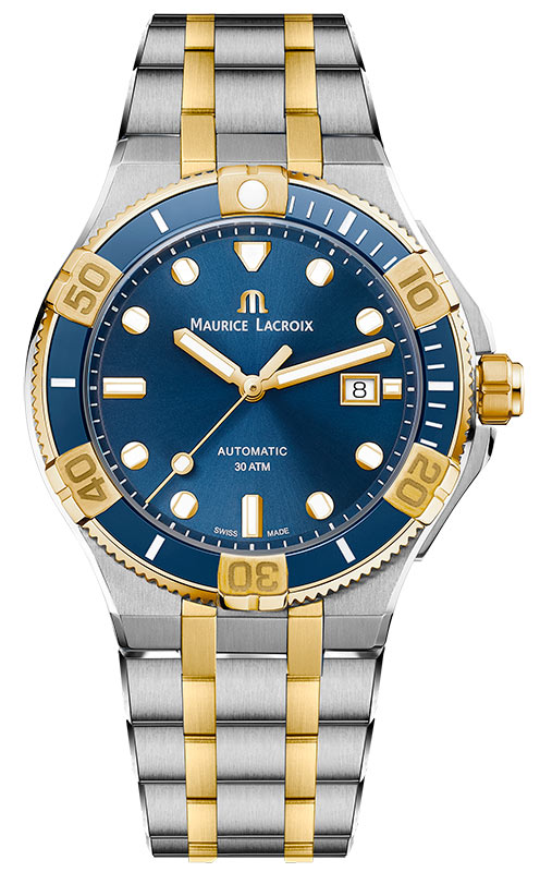 AI6058-SY013-430-1 , je další novinka v oceli a zlatě, s ocelovými prvky zlacenými 2N žlutým zlatem. Malé články náramku, krajka a paže, stejně jako světlé a jemné akcenty oživují starý funkční model. Funkce této verze je však zcela odlišná: tmavě modrý sluncem broušený ciferník s keramickou lunetou ve stejném odstínu, který mu dodává sportovní a elegantní vzhled, odráží skutečné využití celokovových hodinek. Výběr 2N žlutého zlata a tmavě modré varianty dává kapele exkluzivní vintage vzhled 80. let, který přidává ke stylu Maurice Lacroix. Systém rychlé výměny pásku Easychange umožňuje uživateli měnit styly ve zlomku sekundy. Prezentované hodinky jsou vybaveny i švýcarským automatickým Machinekem ML 115 a dostupnost se ukázala v limitované edici 500 kusů.