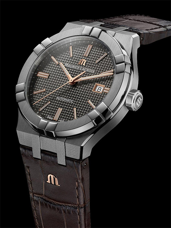 Aikon Automatic se Machinekem ML115 má průměr 42 mm. Vodotěsné do 200 m, v ocelovém pouzdře. Šedý odstín ciferníku plynule splývá s koženým řemínkem, který zdobí písmeno „M“ – logo Maurice Lacroix. Vybavena jemnou motýlkovou sponou, která majiteli poskytuje ještě větší pohodlí.