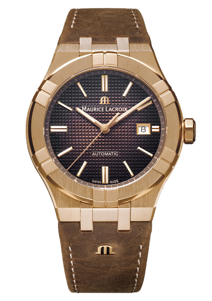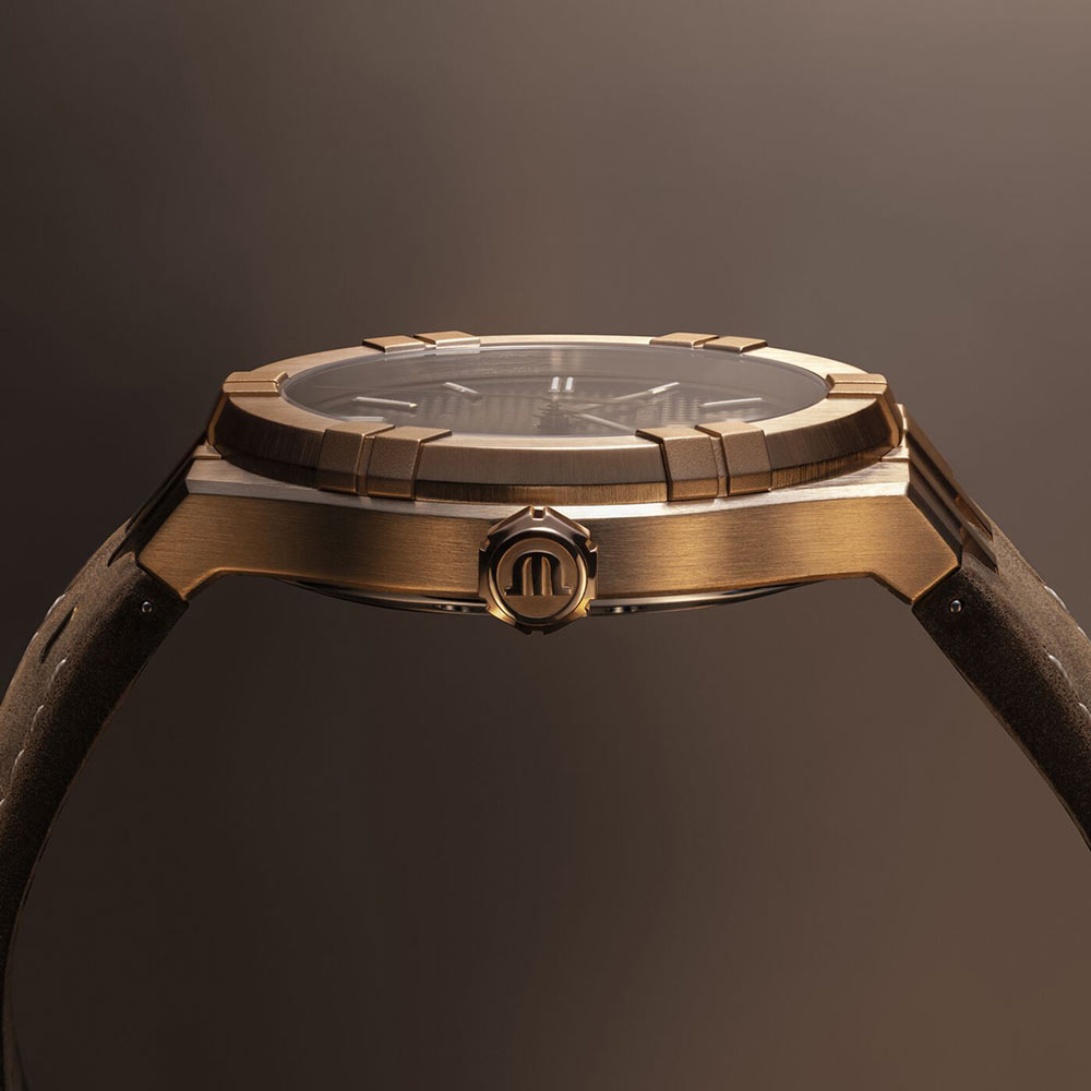 Hodinky Maurice Lacroix Aikon mají masivní pouzdro o průměru 42 mm vyrobené z broušeného bronzu. Obálka harmonicky ladí s pískovanými prvky na rámečku a dodává hodinkám hloubku a charakter. Díky výšce obálky 11 mm zůstávají hodinky na zápěstí elegantní a diskrétní a zároveň vyzařují jistotu. Zadní strana hodinek, uzavíraná sedmi pevnými šrouby, je vyrobena z ušlechtilé oceli a je opatřena průhledným safírovým sklem, které umožňuje obdivovat fascinující automatický mechanismus. Hnědý kožený řemínek ve vintage stylu, integrovaný do obálky a zdobený charakteristickým emblémem „M“ v barvě 4N Gold, dodává hodinkám jedinečný půvab. Kožený náramek je vybaven patentovaným systémem EasyStrap, který umožňuje rychlou výměnu bez nutnosti použití speciálního nástroje.