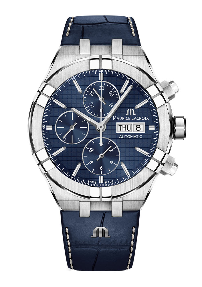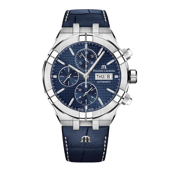 Na přední straně hodinek Maurice Lacroix je charakteristická luneta a tvrdé safírové sklíčko, známé fanouškům značky. Antireflexní safírové okénko chrání modrý ciferník. Přehledné ručičky a indexy budou díky luminiscenčnímu materiálu ukazovat aktuální čas i za horšího osvětlení. Číselník má čítače funkcí chronografu ve 12 a 9 hodin a 12/24 hodinový čas v 6 hodin. Třetí hodina je vyhrazena funkci den-datum - lze z ní vyčíst aktuální den v týdnu a den v měsíci. Design číselníku vytváří stylový vzor malých čtverců. Funkce měření času, chronografu a datumu jsou poháněny pohybem zápěstí. Hodinky Maurice Lacroix Aikon Automatic Chrono jsou vybaveny automatickým kalibrem ML112, který byl vytvořen založené na vynikajícím mechanismu ETA Valjoux 7750.