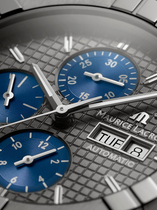 Tmavě šedá barva nepochybně inspirovala výběr ciferníku ve stejném chromatickém stylu. Povrch je vyražen výrazným čtvercovým vzorem, typickým pro automatické chronografy AIKON. Obsahuje emblematickou šedou barvu Gunmetal broušenou se vzorem sunburst pro nekonečnou hru odlesků. Počítadlo minut a hodin chronografu spolu s malou vteřinovou ručkou jsou modré a vylepšené leštěným rámečkem kolem něj. Vyleštěná a věrná DNA kolekce AIKON jsou také výrazná ramena lunety.