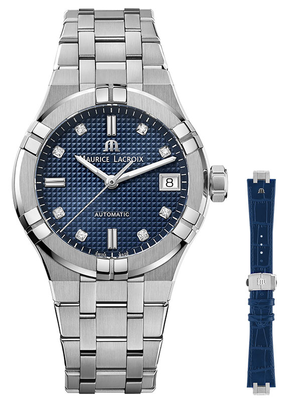 Od svého uvedení na trh v roce 2016 se AIKON ukázaly jako velmi oblíbené pánské hodinky. I když však AIKON 35mm sdílí určitou DNA se svými mužskými sourozenci, má svou vlastní výraznou ženskou identitu. Modrý ciferník se vzorem Clous de Paris je osazen 8 diamanty zasazenými do čtvercových indexů. Pouzdro a náramek jsou vyrobeny z nerezové oceli. Ergonomický design hýčká zápěstí uživatele a zajišťuje vysoký komfort nošení. Leštěné a matné prvky hodinek poskytují vkusnou hru světla. Každý náramek je vybaven systémem Maurice Lacroix Easy Change System, který umožňuje nositelům vyměnit náramek za alternativní řemínek. Pro tento úkol nejsou potřeba žádné náMachinee a nový vzhled lze dosáhnout během okamžiku.