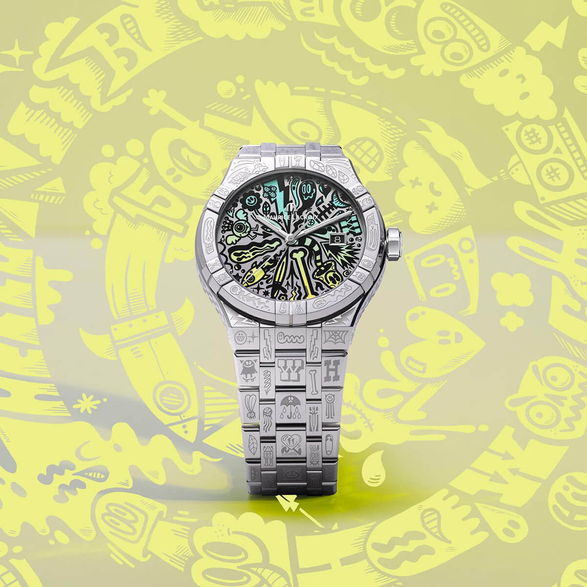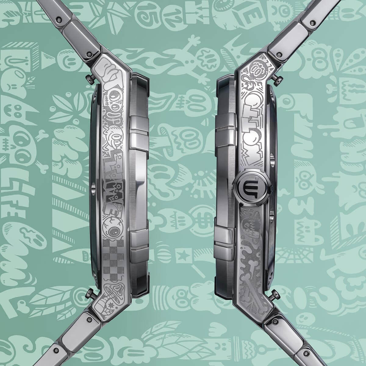 42milimetrové ocelové pouzdro, náramek a luneta jsou celé pokryté jemným rytím plným charakteristických prvků Wotto – od roztomilých, mírně excentrických postav přes blesky a srdíčka až po duchy na skateboardech. Umělecká kompozice připomínající hieroglyfy plynule přechází z náramku na pouzdro a číselník, čímž vytváří jednotnou vizi, kde každý detail vypráví svůj vlastní příběh. Tyto vzory získávají ještě větší hloubku díky kontrastu mezi leštěným povrchem a matným rytím. Samotný ciferník se odlišuje od ostatních modelů Urban Tribe – Wotto dostal absolutní tvůrčí svobodu a plně ji využil, když vytvořil dynamickou kompozici hravých postav seřazených do barevného přechodu od žluté po modrou. Indexy jsou minimalistické, aby neodváděly pozornost od této barevné exploze kreativity, čímž zároveň podtrhují jedinečný charakter časomíry.