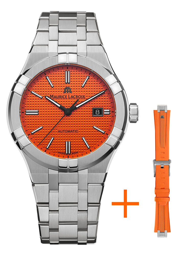 Pod vysoce odolným safírovým sklíčkem je oranžový ciferník - Clous de Paris. Na ciferníku ve 12 hodin je radostné logo značky Maurice Lacroix. Aktuální čas ukazují velké a čitelné ručičky. Když není světlo, pomůže odečítat čas speciální luminiscenční hmota, která osvětlí ručičky. Ve 3 hodiny je datumové okno s aktuálním dnem v měsíci. Design ciferníku je elegantní a čitelný. Umožní vám to na první pohled okamžitě přečíst čas. Pod číselníkem je přesný automatický Machineek od Maurice Lacroix ML115 . Mechaniku zdobil rotor s logem M - od Maurice Lacroix, který byl pokryt rhodiem. Práci tohoto komplikovaného systému lze obdivovat díky průhlednému víku na zadní straně pouzdra hodinek.