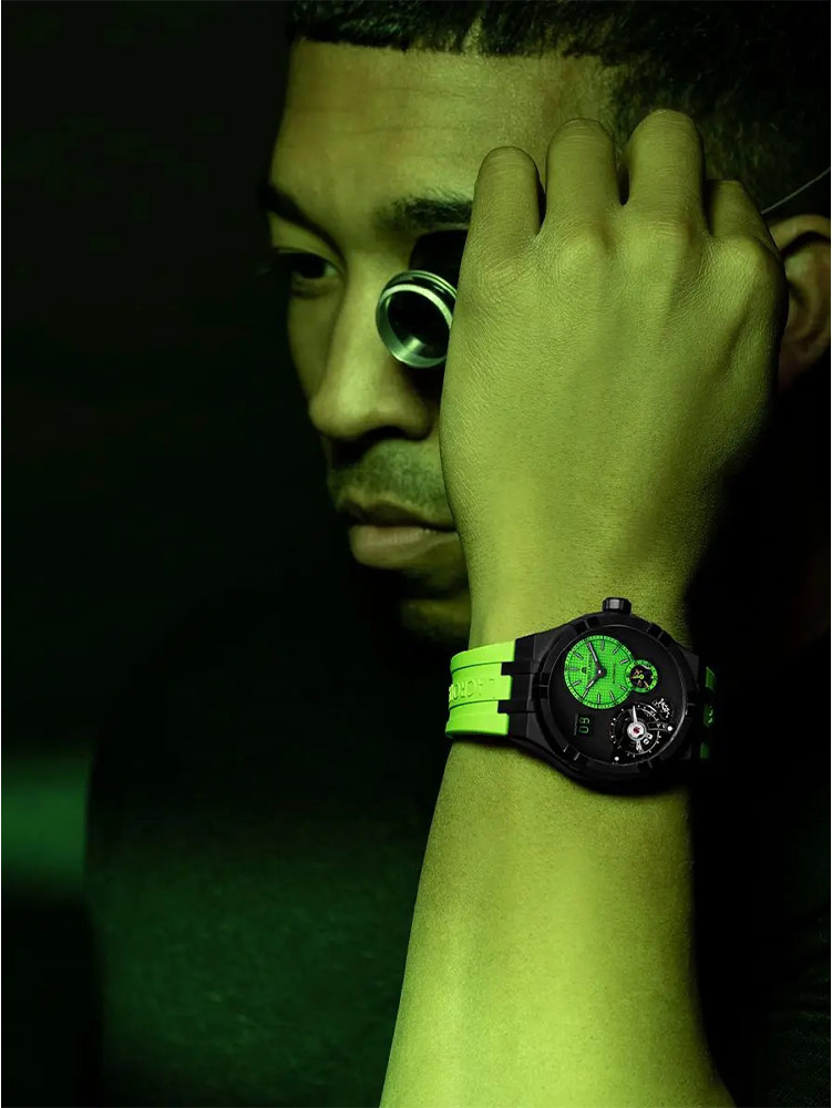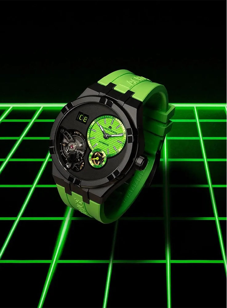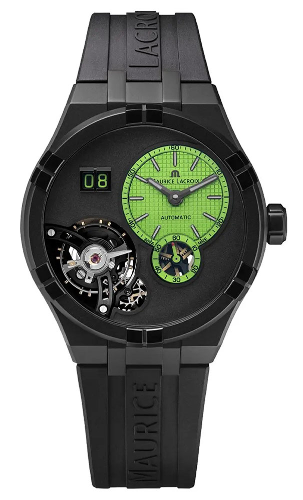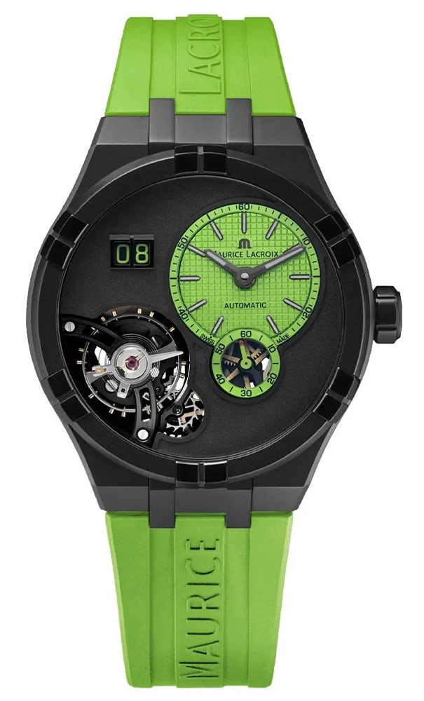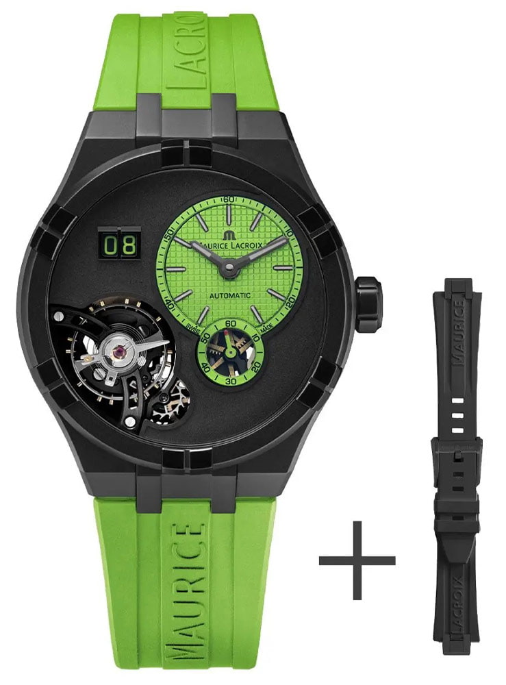 Stejně jako u ostatních členů řady AIKON se pouzdro vyhýbá běžným výstupkům a spojuje popruh dohromady pro působivé pohodlí při nošení. Maurice Lacroix se rozhodl tento model vybavit novým stylem gumového pásku v zelené barvě s reliéfem názvu značky. Pánské hodinky s otevřeným srdcem mají vlastní systém snadné výměny řemínku, který usnadňuje přepínání z jednoho řemínku na druhý bez použití nářadí.