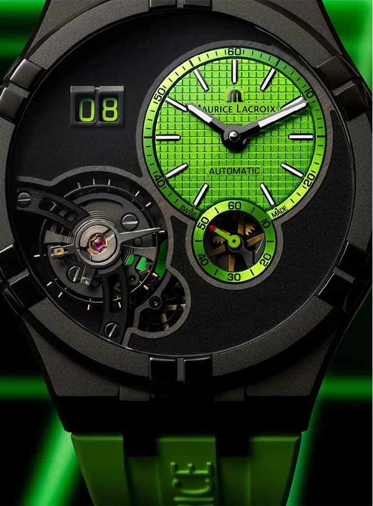 Klíčová fakta o pánských hodinkách Maurice Lacroix AI6118-DLB0J-630-I. V roce 2021 švýcarský hodinář Maurice Lacroix představil AIKON Master Grand Date, hodinky, které spojují mechanickou dokonalost kolekce Masterpiece s městským stylem AIKON. Nyní značka s potěšením oznamuje uvedení nové verze tohoto modelu, AIKON Master Grand Date, hodinek, které do hry vnášejí protichůdné odstíny černé a zelené.