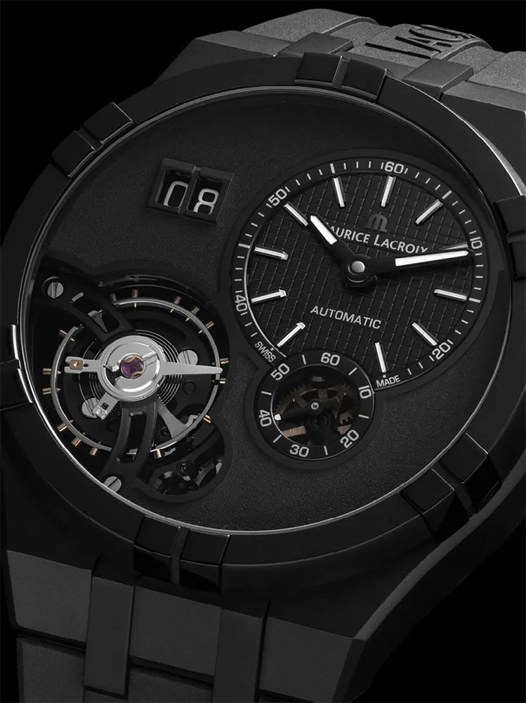 Skeletové hodinky Maurice Lacroix Aikon Master Grand Date Black jsou prezentovány ve velkém 45mm pouzdru z nerezové oceli potažené černou DLC. Jeho decentní vzhled je vkusný bez vynaložení jakékoli námahy. Číselník dodává smysl a zároveň odhaluje četné exkluzivní součásti Machineku v pohybu. Tento konkrétní číselník zaujme různými sofistikovanými dekoracemi, jako je vertikální kartáčování, DLC black grain, DLC black sun brushing balančního můstku, DLC černé pískování. To vše posiluje nenápadnou povahu hodinek s viditelným Machinekem Maurice Lacroix.