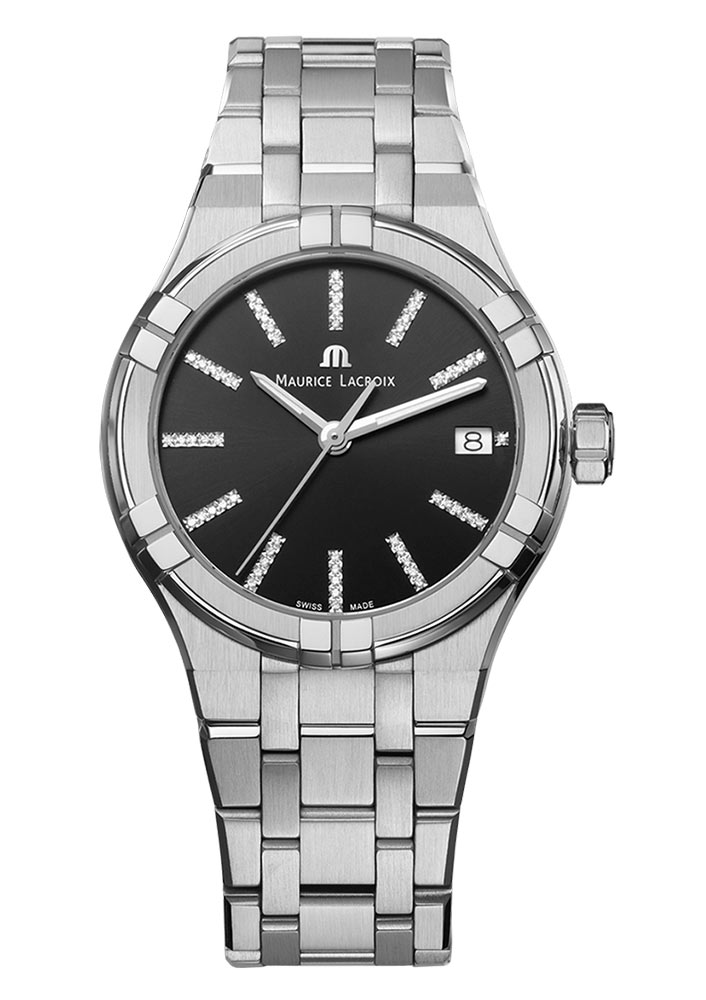 Elegantní diamantové sportovní hodinky Maurice Lacroix Aikon Quartz jsou prezentovány v univerzální 35mm velikosti, která skvěle padne každé dámě. Jeho rozvržení značení je čisté a minimalistické. Skládá se z exkluzivních diamantových indexů a 3 hand. Dva z nich, označující hodiny a minuty, jsou vyplněny luminiscenční látkou, která zajišťuje čitelnost ve tmě. Na 3. hodině je obdélníkové datumové okénko s černým číslem na bílém pozadí. Pod severním indexem je tradičně zobrazeno logo značky a úplně dole podpis potvrzující švýcarský Origin. Další užitečnou funkcí nejnovějších modelů AIKON Quartz je systém snadné výměny řemínku. Díky němu může uživatel bez použití nářadí sejmout náramek z časomíry a nahradit jej alternativním páskem z kůže, kovu nebo gumy.