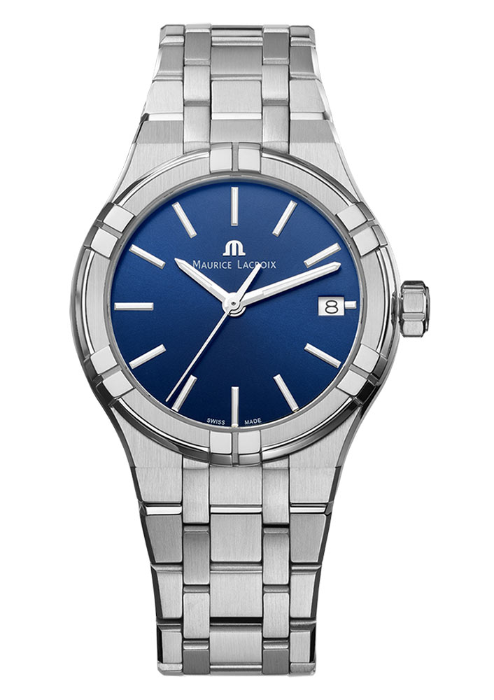Dámské sportovní hodinky Maurice Lacroix Aikon Quartz s modrým ciferníkem se představují v univerzální velikosti 35mm , která skvěle padne každé dámě. Jeho rozvržení značení je čisté a minimalistické. Je vyrobena z jemných, rhodiovaných lineárních indexů a 3 ruček. Dva z nich, označující hodiny a minuty, jsou vyplněny luminiscenční látkou, která zajišťuje čitelnost ve tmě. Na 3. hodině je obdélníkové datumové okénko s černým číslem na bílém pozadí. Pod severním indexem je tradičně zobrazeno logo značky a úplně dole podpis potvrzující švýcarský Origin. Další užitečnou funkcí nejnovějších modelů AIKON Quartz je systém snadné výměny řemínku. Díky němu má uživatel možnost sejmout náramek z časomíry bez použití nářadí a nahradit jej alternativním páskem z kůže, kovu nebo gumy.