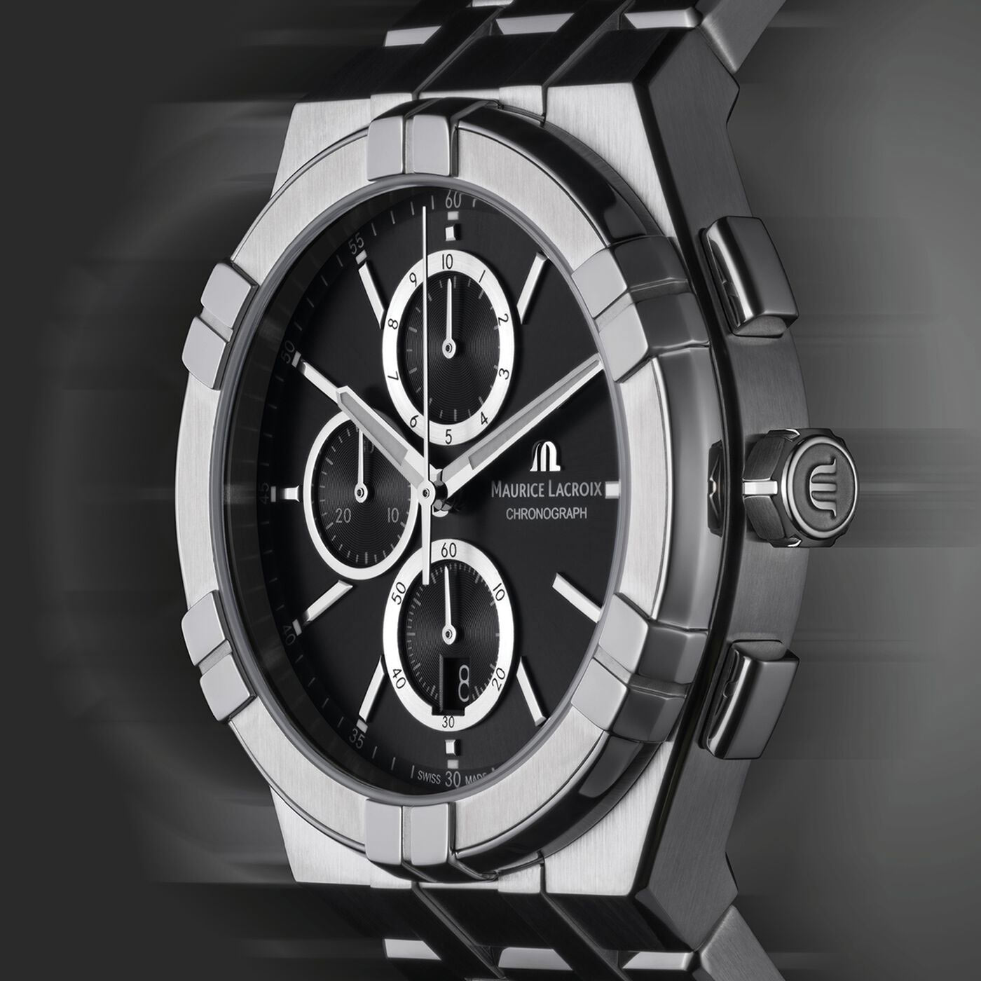 Přední strana pouzdra má safírové sklo odolné proti poškrábání s antireflexní vrstvou. Antireflex je povlak, který odráží světelné paprsky, což zvyšuje přehlednost čtení číselníku. Černý ciferník byl obohacen o broušený povrch, který krásně splyne se světlem a poskytuje značnou míru propracovanosti. Na číselníku jsou umístěny speciální čítače chronografu. Pánské hodinky Maurice Lacroix AIKON Quartz Chronograph jsou perfektní pro sledování času obchodního jednání, cestování nebo fyzické aktivity. Datumové okénko v 6 hodin je užitečným pomocníkem při sledování ubíhajících dnů v kalendáři. Náramkové hodinky Maurice Lacroix pohání švýcarský mechanismus s označením Swiss Made. Zaručuje velmi dobrý chod ruček, datumovky a počítadel chronografu.