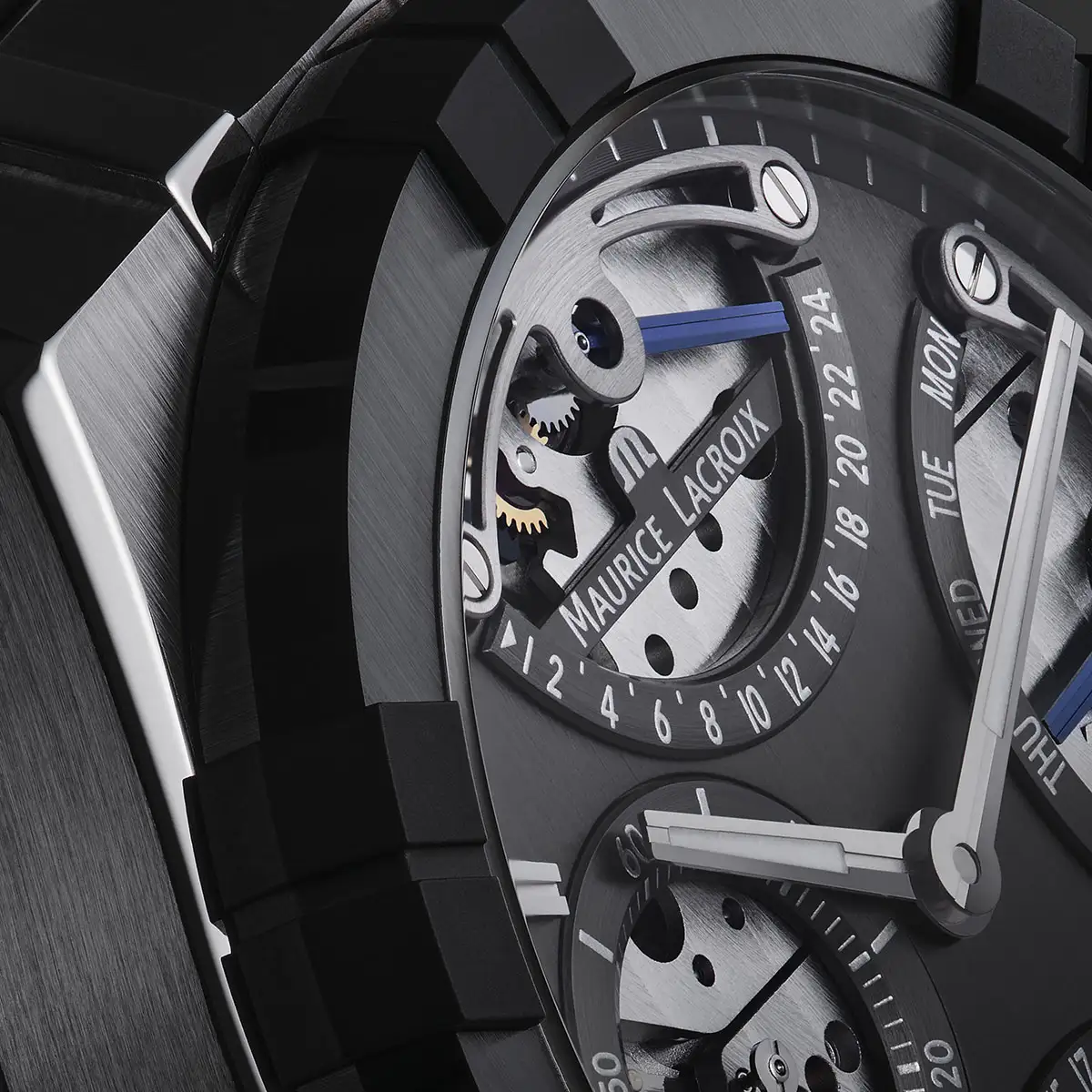 Ve světě vysokého hodinářství se jen zřídka setkává tak povedené spojení avantgardní technologie s dravým, městským designem. Maurice Lacroix Aikonic Master Triple Retrograde AC6068-SSL20-230-2 jsou průlomové hodinky, které přenášejí prestižní komplikace linie Masterpiece do sportovního pouzdra kolekce Aikon. Centrálním prvkem tohoto mistrovského díla je ciferník v antracitové barvě s vertikálním broušením, který zdobí čtyři skeletonizovaná okna odhalující precizně zdobený mechanismus. Právě skrze tyto otvory lze obdivovat chod automatického kalibru ML291, zdobeného tradičními ženevskými pruhy. Pouzdro o průměru 43 mm z ušlechtilé oceli je doplněno lunetou z černé, proti poškrábání odolné keramiky, což hodinkám dodává moderní a vysoce technický vzhled.