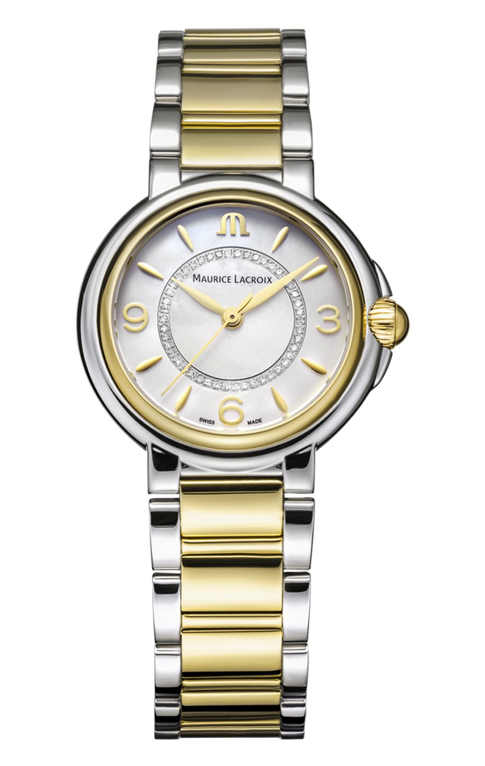 Umieszczony w 32 mm kopercie ze stali nierdzewnej, zegarek damski Maurice Lacroix FIABA TRIO zawieszony został na solidnej bransolecie z bezpiecznym i komfortowym w użyciu zapięciem motylkowym. Maurice Lacroix na nowo wyobraził sobie model FIABA, zachowując jego unikatowy charakter, a jednocześnie nasycając go sporą dawką miejskiego szyku. Koronka tego modelu ozdobiona została Kaboszonem — jest to ozdobny kamień szlachetny oszlifowany na gładko. Zegarek damski Maurice Lacroix na bransolecie bicolor to przepiękny dodatek, który wygodnie ułoży się na każdym kobiecym nadgarstku. Projekt tego czasomierza ułatwia dopasowanie go do lekkiej sukienki, jak i eleganckiego outfitu. Zegarek damski Maurice Lacroix z diamentami polubi się z różnego rodzaju dodatkami biżuteryjnymi.