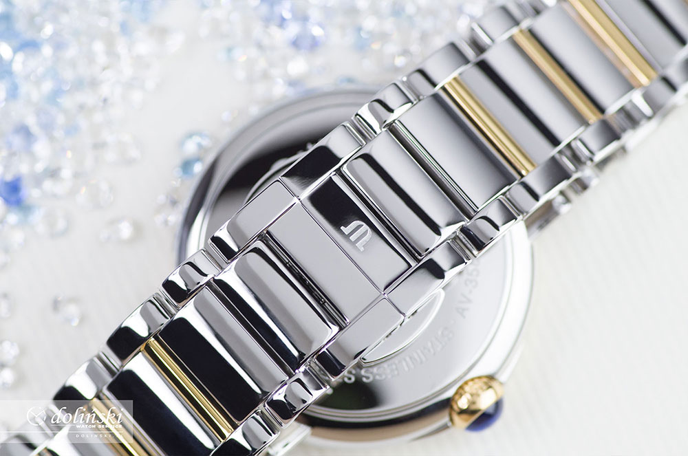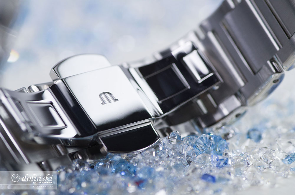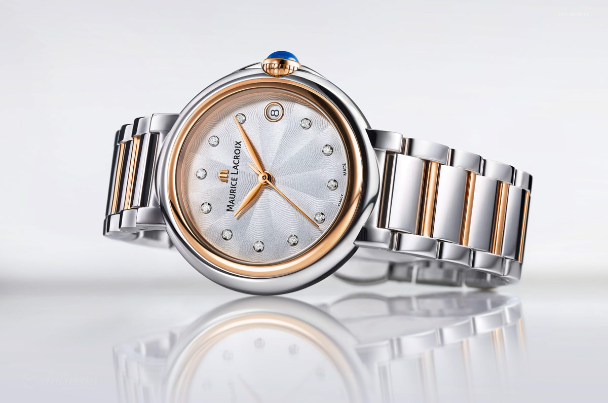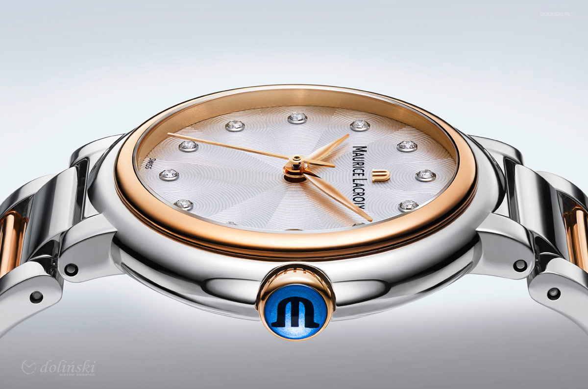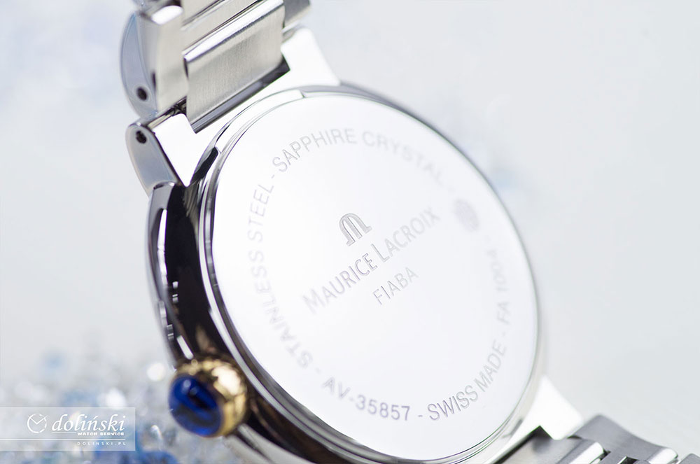 Kapka vodyKapka vody poskytla inspiraci pro krásně zpracovaný číselník. Ciferník se leskne a třpytí jako hladina jezera osvětleného měsíčním světlem, na které dopadá kapka vody a vytváří jemné vlny směřující ven. Tento romantický koncept poskytl inspiraci pro vytvoření číselníku Maurice Lacroix Fiaba. Zlaté listové ručičky jasně ukazují čas. Kruhový rámeček data ukazuje den v měsíci. Každý kus náramku Maurice Lacroix Fiaba je zaoblený. Žádné ostré hrany, každá část jemně hladí zápěstí uživatele. Každý článek je pohyblivý pro větší pohodlí a poskytuje jemný vzhled. Kabošonová korunka pro nastavení času byla zdobena drahým spinelem. Modrý odstín je nápadný a umocňuje pocit luxusu.