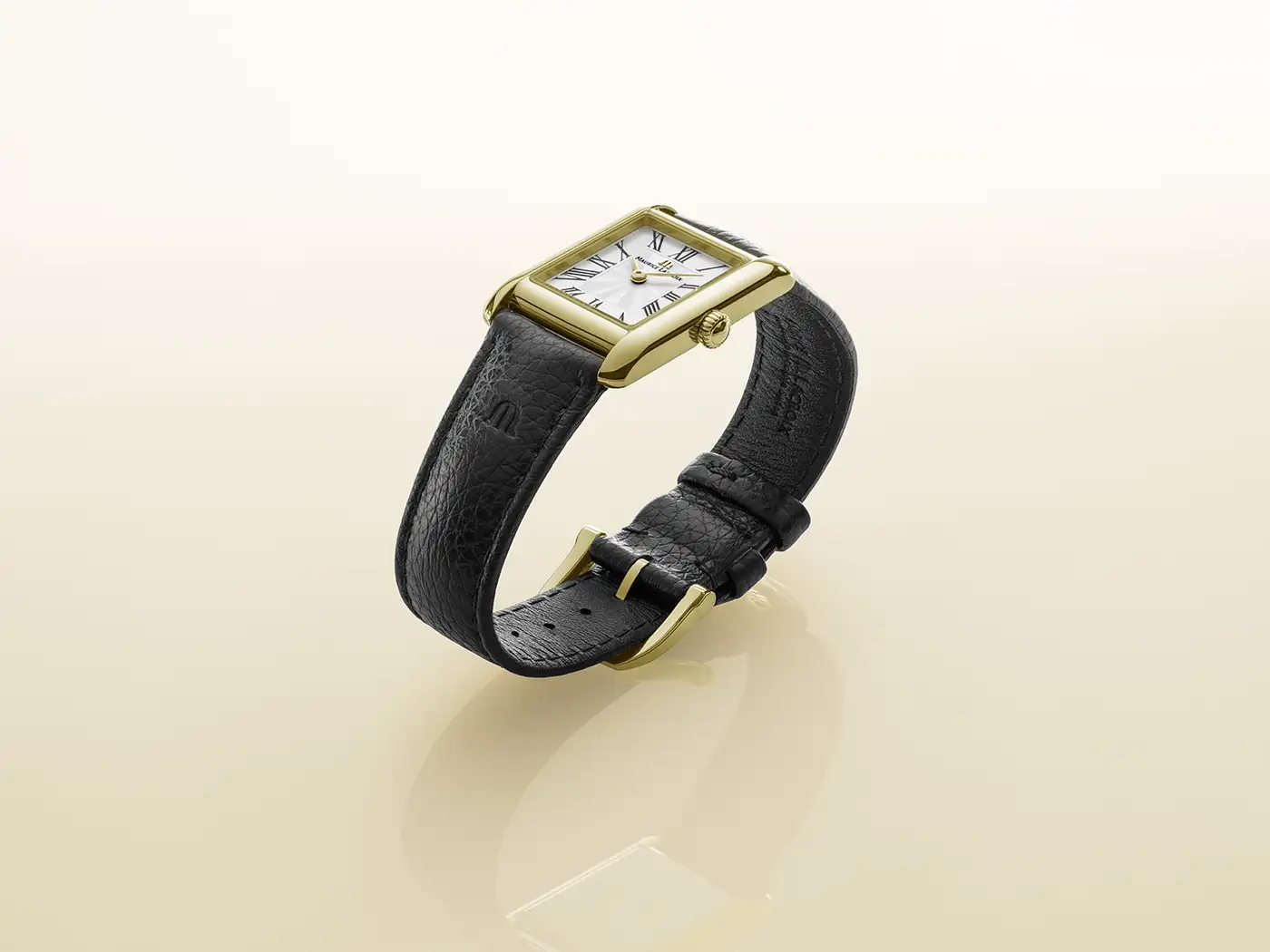 Model s referencí FA1205-PVY01-110-2 z kolekce Fiaba Square je osazen klasickým černým řemínkem z telecí kůže, zdobeným raženým logem „M“ a jemným tónovým prošitím. Toto spojení klasiky a funkčnosti nabízí díky systému snadné výměny řemínku také možnost personalizace. Pozlacené dámské hodinky na černém koženém řemínku Maurice Lacroix se tak stávají elegantním doplňkem jak pro formální, tak pro večerní outfity.
