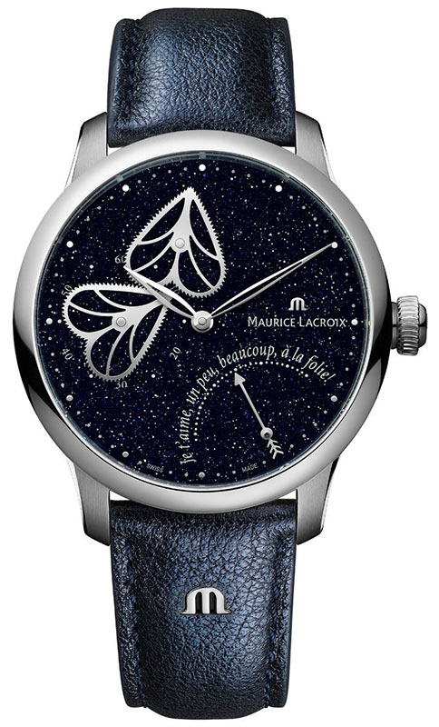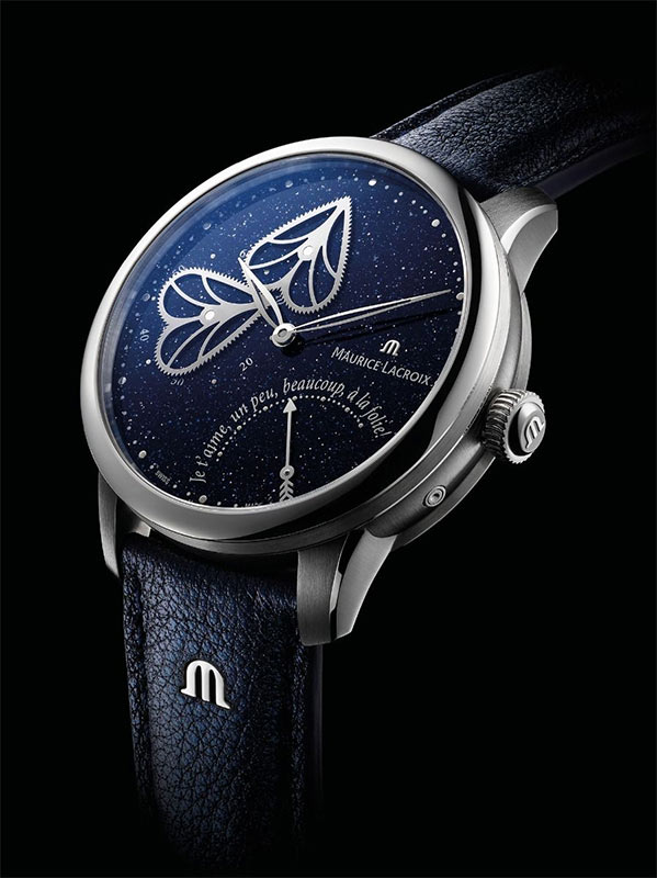 Maurice Lacroix Masterpiece Embrace MP6068-SS001-430-1 jsou hodinky, které jedinečným způsobem spojují umělecký výraz s technickou kreativitou, kterou lze spatřit jak v nočních barvách, poutavých dekoracích, tak v praktických řešeních. Dvě kosterní srdce, částečně propletená, neustále v pohybu, jsou metaforou lidských vztahů, které navzdory vzestupům a pádům zůstanou navždy spolu – ve věčném objetí. Další ozdobou je věčný kalendář o páté, který s přihlédnutím ke všem změnám v průběhu roku ukáže majiteli vždy správný den v měsíci. Aktuální den označuje šipka s indiánským motivem, symbolizující dobro a bezpečí v kulturách. A co víc, na kruhové čáře nad měsíčním měřítkem vede fráze „Miluji tě“ ve francouzštině (považovaná za nejromantičtější jazyk na světě) „ je't aime un peu beaucoup a la folie “, která vyjadřuje stále silnější emoce. jak dny plynou. Od "Miluji tě trochu, hodně, k šílenství". V kombinaci se zmíněnými srdíčky a vyobrazeným na číselníku v odstínu modrého avanturínu s potiskem v barvě stříbrného prášku - hvězdného prachu integruje neprobádanou, duchovní sféru s pozemským světem pocitů, dokazuje autentické umění Maurice Lacroixe řemeslo.