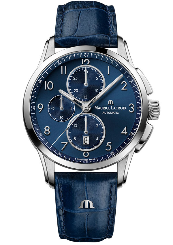 Elegantní 43mm pouzdro s hladkou lunetou je mírně prohnuté, na povrchu leštěné a na tenké hraně satinováno. Korunka s nastavením času je tvarovaná a zakončená spirálovými řezy. Dvojitá oka mají výrazný tvar háčku se saténovým povrchem na první vrstvě a leštěnou a zapuštěnou vnější druhou vrstvu. Tato střídající se sada matných a lesklých povrchů zdůrazňuje profil pouzdra společný celé řadě. Modrý ciferník s arabskými indexy chrání safírové sklíčko extrémně odolné proti poškrábání. Zadní strana hodinek je prosklená a odhaluje krásně zpracovaný automatický Machineek ML112 Sellita SW500 s funkcí chronografu. Luxusní modrý řemínek je vyroben z přírodní telecí kůže a je obohacen o logo Maurice Lacroix. Zapíná a odepíná se pohodlnou motýlkovou sponou rozepínanou na knoflíky.