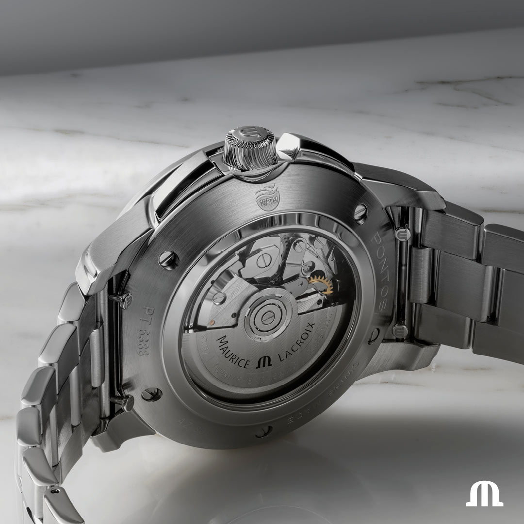 Zadní strana vitríny umožňuje obdivovat automatický kalibr ML 112. Tento švýcarský Machineek je zdoben horizontálním povrchem Côtes de Genève a kulatým zrnem, zatímco rotor je zdoben vertikálním Côtes de Genève a slunečním kartáčkem. Automatické pánské hodinky s chronografem Maurice Lacroix byly nabízeny na 3řadém náramku z nerezové oceli. V souladu s charakteristikou této oblíbené kolekce je nový PONTOS Chronograph 43 mm vybaven systémem snadné výměny řemínku. Zaručuje jednoduchý, snadno použitelný způsob výměny řemene za jiný bez potřeby nářadí.