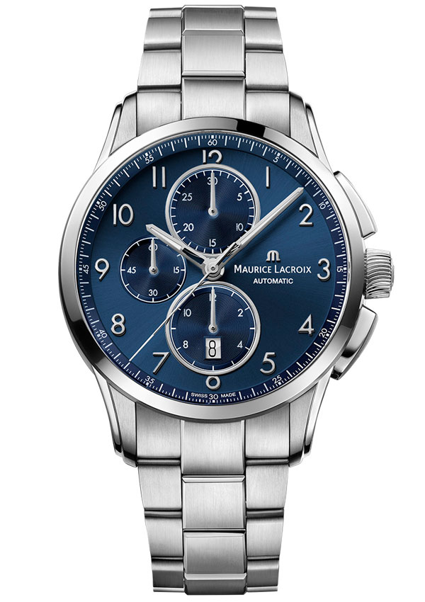 Elegantní 43mm pouzdro s hladkou lunetou je mírně prohnuté, na povrchu leštěné a na tenké hraně satinováno. Korunka s nastavením času je tvarovaná a zakončená spirálovými řezy. Dvojitá oka mají výrazný tvar háčku se saténovým povrchem na první vrstvě a leštěnou a zapuštěnou vnější druhou vrstvu. Tato střídající se sada matných a lesklých povrchů zdůrazňuje profil pouzdra společný celé řadě. Modrý ciferník s arabskými indexy chrání safírové sklíčko extrémně odolné proti poškrábání. Zadní strana hodinek je prosklená a odhaluje krásně zpracovaný automatický Machineek ML112 Sellita SW500 s funkcí chronografu. Elegantní, a přesto pevný náramek v matném provedení s motýlkovou sponou, která se zapíná na knoflíky.