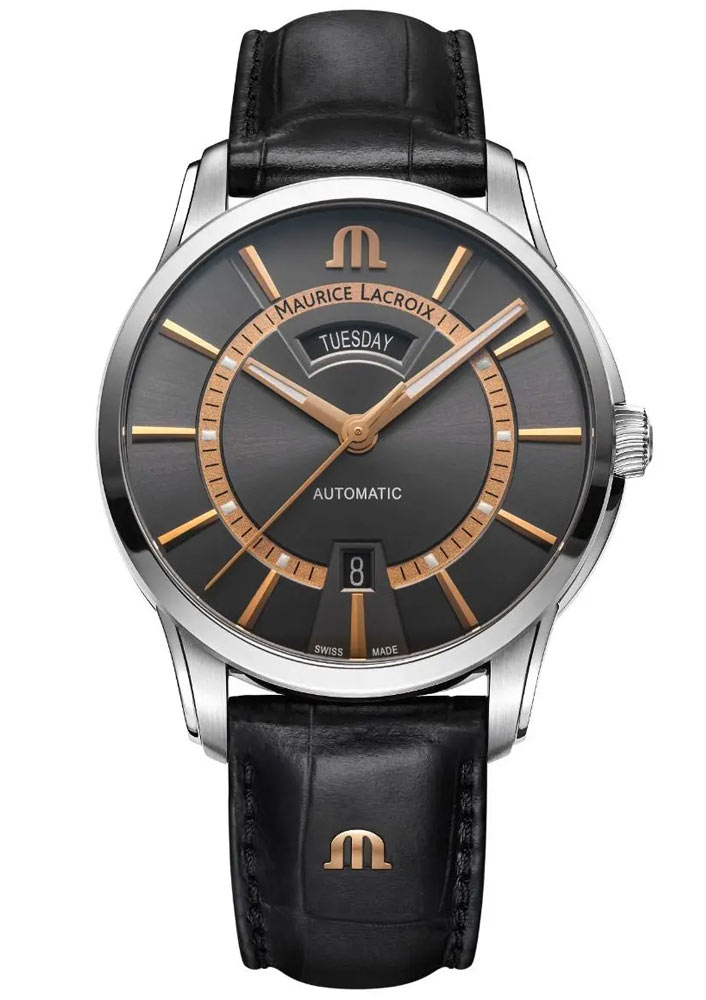 Uvážlivým umístěním různých odstínů, textur, linií a křivek vedle sebe vytvořil Maurice Lacroix číselník, který je bohatý na detaily, nádherně zpracovaný a extrémně snadno čitelný. Fazetované hodinové a minutové ručičky potažené bílým povlakem Super-LumiNova spolupracují s aplikovanými indexy, aby jasně a stylově vyjadřovaly čas. Minutová stopa nepřiléhá k okraji ciferníku, ale sedí uvnitř hodinové stopy a poskytuje atraktivní přerušení tradice. Mírně zapuštěná dráha využívá úhledné značení a kontrast pro zajištění čitelnosti.