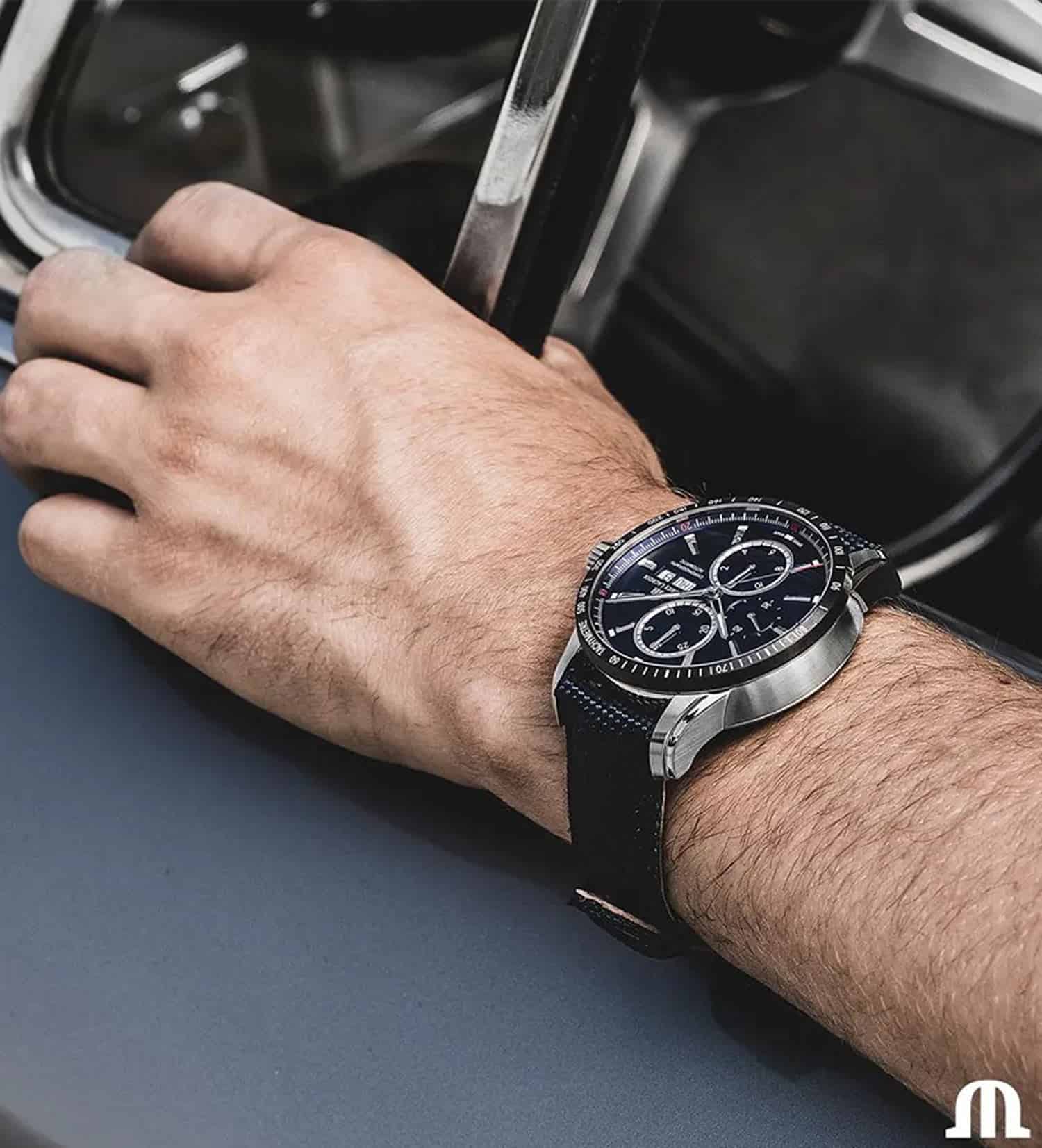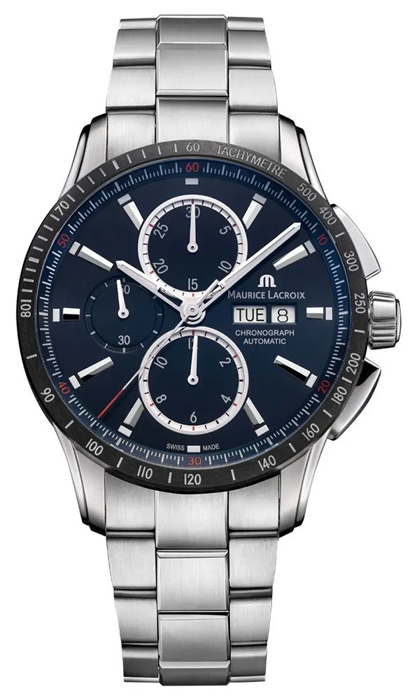 Na první pohled se může zdát, že ciferník těchto sportovních náramkových pánských hodinek Maurice Lacroix má pouze dva počítadla uspořádané podél osy sever-jih. Při bližším zkoumání je však jasné, že na 9. hodině a naproti zobrazení dne v měsíci a týdnu je malý sekundový číselník, všechny jsou dobře čitelné. Dominantní čítače se skládají z 30minutového registru ve 12 hodin a 12hodinového registru níže. Každý z nich se skládá z pískovaného středu a kruhového rámu s detailem šneka. Designérský tým Maurice Lacroix obohatil kompozici o četné prvky a dal uživateli číselník s různými výškovými úrovněmi a s rozumně zvolenými barvami, což obohacuje zážitek z vlastnictví.