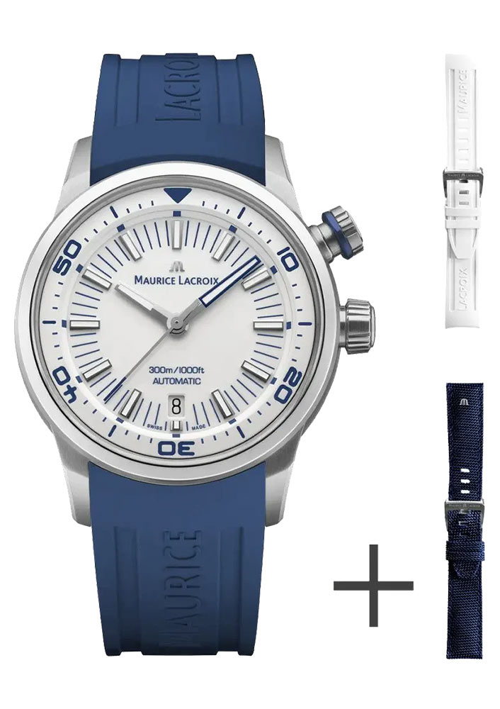 Speciální korunka nastavená na 2 hodiny poskytuje možnost nastavení vnitřní otočné lunety. Otočná luneta, vybavená počítací stupnicí, poskytuje funkční metodu měření času stráveného pod vodou . Hodinky mají také centrální vteřinovou ručku a datumovku na 6. hodině Druhá korunka umístěná na 3. hodině upravuje různé indikace a lze ji použít i pro ruční nátah. Výše uvedený model je k dispozici s bílým lakovaným číselníkem a dvěma přídavnými pásky pro snadnou výměnu bez použití nářadí . Jedna je vyrobena z tmavě modré vintage látky s logem M a druhá je z bílé gumy s vyraženým „Maurice Lacroix“. Hodinky v dárkové sadě Maurice Lacroix Pontos S Diver pohání švýcarský automatický Machineek, kalibr ML115, který při nošení eliminuje nutnost ručního natahování.