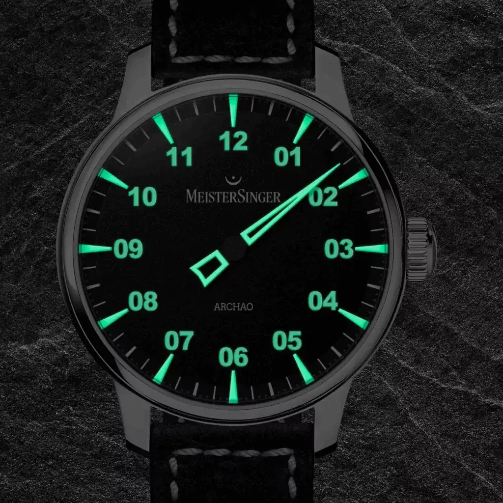 Automatické pánské hodinky MeisterSinger Archao Black s černým ciferníkem zaujmou i po setmění, kdy luminiscenční detaily odhalují plnou sílu jejich výrazného charakteru. Čitelné dvoumístné arabské číslice, aplikované hodinové indexy a charakteristická jehlovitá ručka byly zhotoveny v podobě bílých LumiBlocks, které akumulují světlo jako baterie a následně jej uvolňují v podobě trvalé, intenzivní záře. Díky tomu jsou MeisterSinger AR902 nejen automatickými hodinkami s výraznou vizuální identitou, ale také modelem s vynikající čitelností ve tmě. Impozantní pouzdro o průměru 43 mm je vyrobeno z ušlechtilé oceli a celek doplňuje vypouklé safírové sklíčko, prosklené dýnko s potiskem, na němž se název modelu „Archao“ objevuje jako transparentní nápis na pozadí inspirovaném vulkánem, a řemínek s dekorativním prošíváním, který harmonicky podtrhuje vintage charakter modelu.