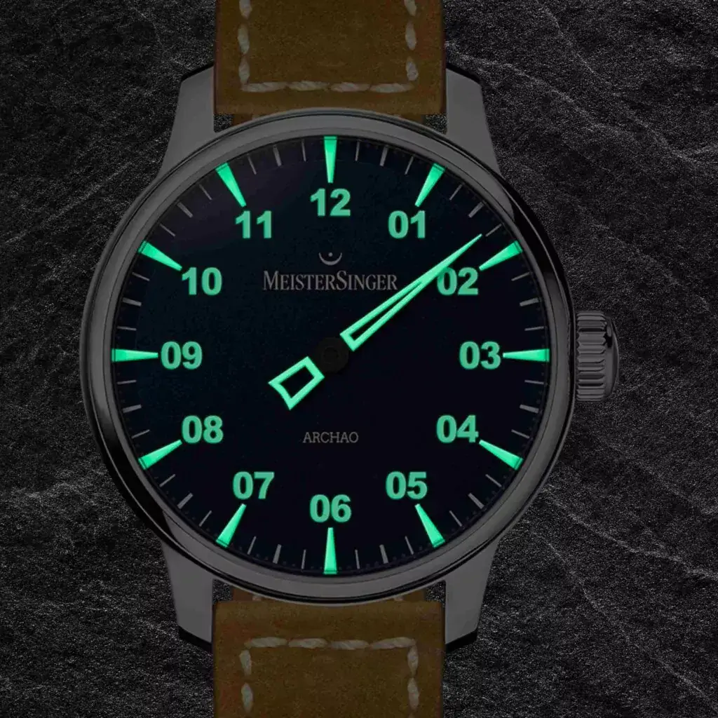 Automatické pánské hodinky MeisterSinger Archao Blue s modrým ciferníkem a medovým řemínkem zaujmou i po setmění, kdy ciferník s luminiscenčními detaily odhaluje plnou sílu svého výrazného charakteru. Dvoumístné arabské číslice, aplikované hodinové indexy a charakteristická jehlovitá ručka byly zhotoveny v podobě bílých LumiBlocks, které akumulují světlo jako baterie a následně jej uvolňují v podobě trvalé, intenzivní záře. Díky tomu jsou MeisterSinger AR908 nejen automatickými hodinkami s výraznou vizuální identitou, ale také modelem s vynikající čitelností po setmění. Impozantní pouzdro o průměru 43 mm je vyrobeno z ušlechtilé oceli a celek doplňuje vypouklé safírové sklíčko, prosklené dýnko s potiskem, na němž se název modelu „Archao“ objevuje jako transparentní nápis na pozadí inspirovaném vulkánem, a medový kožený řemínek se světlým dekorativním prošíváním, který efektně kontrastuje s tmavým pouzdrem a modrým ciferníkem.
