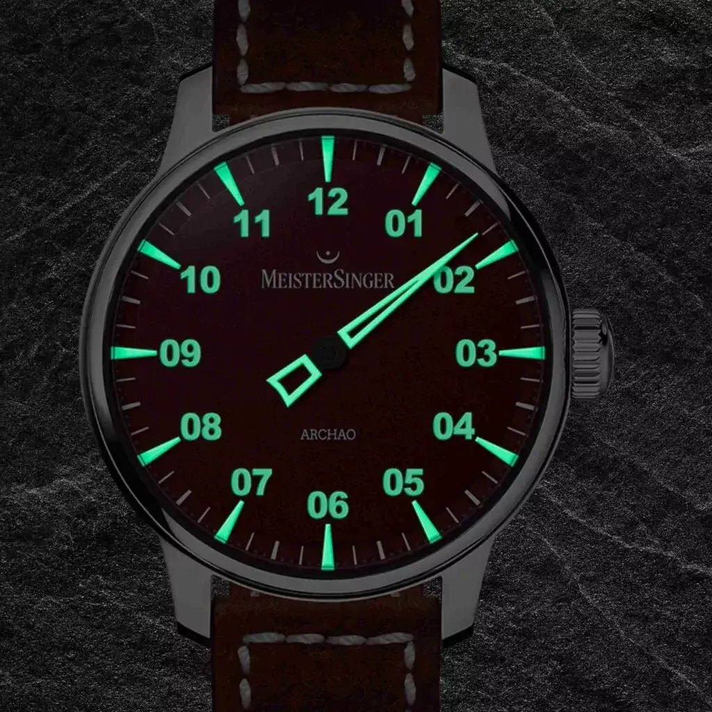 Automatické pánské hodinky MeisterSinger Archao Red zaujmou i po setmění, kdy vínový ciferník s luminiscenčními detaily odhaluje plnou sílu svého výrazného charakteru. Výrazné dvoumístné arabské číslice, aplikované hodinové indexy a charakteristická jehlovitá ručka byly zhotoveny v podobě bílých LumiBlocks, které akumulují světlo jako baterie a následně jej uvolňují v podobě trvalé, intenzivní záře. Díky tomu jsou MeisterSinger AR911 nejen automatickými hodinkami s výraznou vizuální identitou, ale také modelem s vynikající čitelností ve tmě. Impozantní pouzdro o průměru 43 mm je vyrobeno z ušlechtilé oceli a celek doplňuje vypouklé safírové sklíčko, prosklené dýnko s potiskem, na němž se název modelu „Archao“ objevuje jako transparentní nápis na pozadí inspirovaném vulkánem, a vínový řemínek s dekorativním prošíváním, který harmonicky podtrhuje vintage charakter modelu.