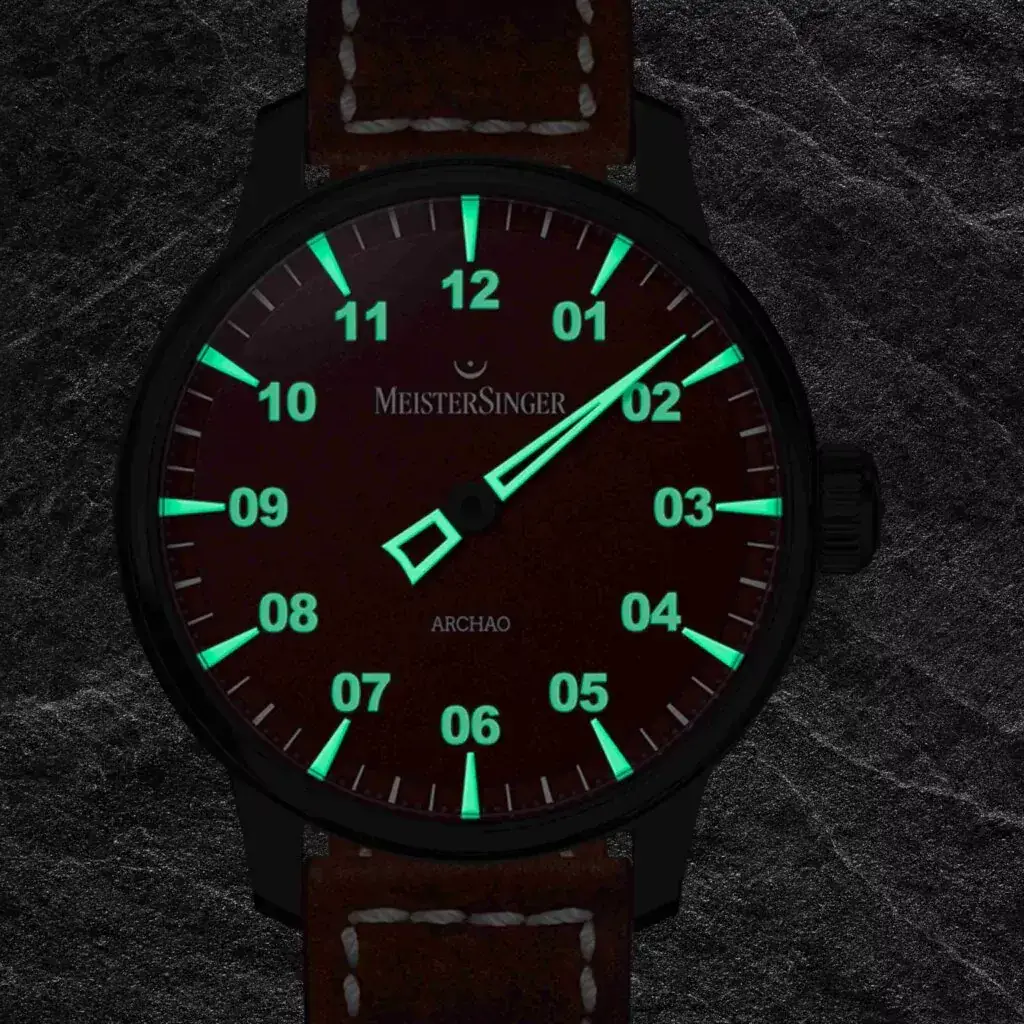 Automatické pánské hodinky MeisterSinger Archao DLC Red zaujmou i po setmění, kdy vínový ciferník s luminiscenčními detaily odhaluje plnou sílu svého výrazného charakteru. Výrazné dvoumístné arabské číslice, aplikované hodinové indexy a charakteristická jehlovitá ručka byly zhotoveny v podobě bílých LumiBlocks, které akumulují světlo jako baterie a následně jej uvolňují v podobě trvalé, intenzivní záře. Díky tomu jsou MeisterSinger AR911BL nejen automatickými hodinkami s výraznou vizuální identitou, ale také modelem s vynikající čitelností ve tmě. Impozantní pouzdro o průměru 43 mm je vyrobeno z ušlechtilé oceli a opatřeno matně černou DLC povrchovou úpravou s diamantovou strukturou, která zvyšuje odolnost povrchu a podtrhuje moderní, technický charakter hodinek. Celek doplňuje vypouklé safírové sklíčko, prosklené dýnko s potiskem, na němž se název modelu „Archao“ objevuje jako transparentní nápis na pozadí inspirovaném vulkánem, a vínový řemínek s dekorativním prošíváním, který harmonicky podtrhuje vintage charakter modelu.