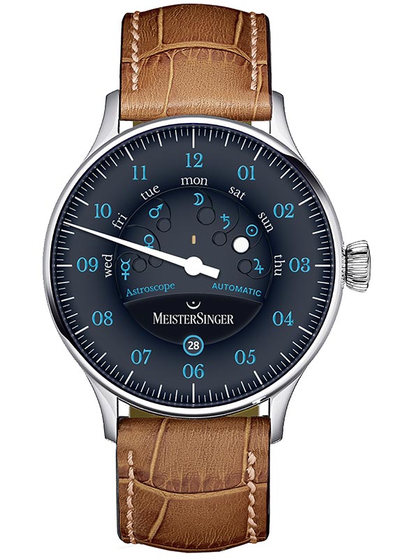 MEISTERSINGER ASTROSCOPE AS902B jsou unikátní hodinky z německé kolekce ASTROSCOPE, představující další díl astronomických hodinek Manfreda Brasslera - zakladatele a hlavního designéra MeisterSinger. Galaktický ciferník, černý jako temná hmota, je konzistentním pozadím pro modré arabské ukazatele hodin a nepravidelně umístěné dny v týdnu, pod nimiž jsou symboly odpovídajících nebeských těles. Podle víry Babyloňanů je číslo sedm posvátnou hodnotou a každý den v týdnu je spojen s planetou, jejíž jméno pochází od římských bohů.