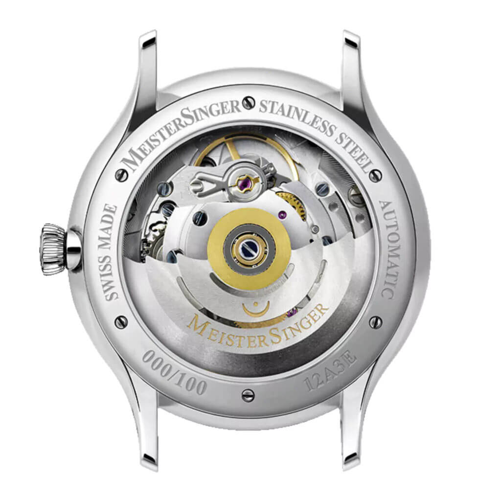 Srdcem hodinek je automatický strojek Sellita SW330 s rezervou chodu až 52 hodin, který zajišťuje přesnost a spolehlivost. Pouzdro je vyrobeno z vysoce kvalitní ušlechtilé oceli o průměru 40 mm – ideální velikost pro většinu zápěstí. Díky vypouklému safírovému sklíčku jsou hodinky odolné proti poškrábání a zůstávají bezchybné i po letech nošení. Průhledné, šroubované víko umožňuje pozorování chodu strojku, čímž ještě více zdůrazňuje hodinářské umění značky MeisterSinger.