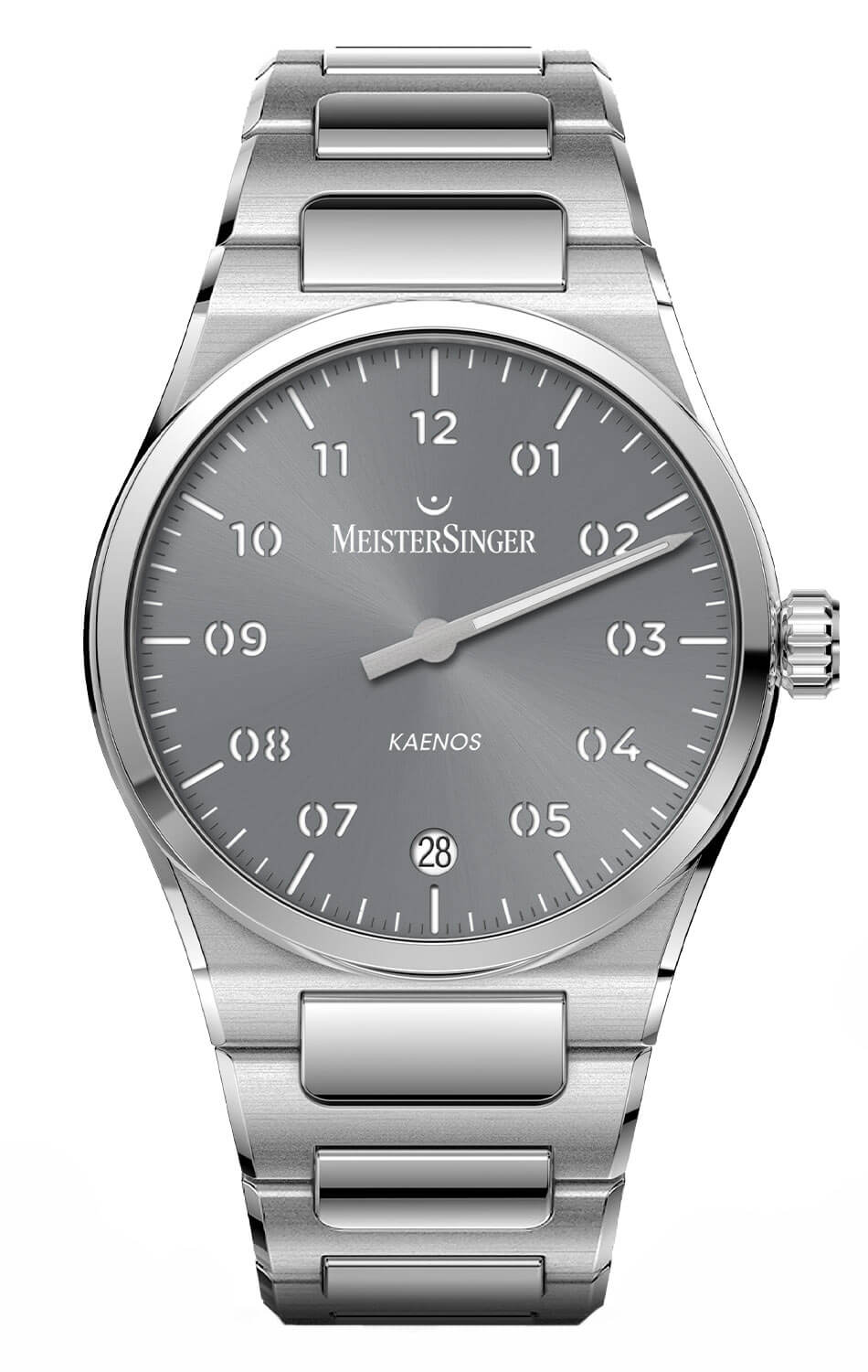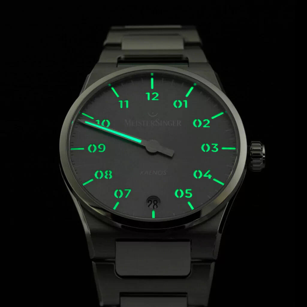 MeisterSinger Kaenos KS927 je model, který redefinuje pojem klasických pánských hodinek, překračuje zažité stylistické konvence. Design založený na principu jednoručkového zobrazení umožňuje pohlížet na čas jinak – ne jako na sled vteřin, ale jako na prostor k využití. Šedý ciferník s matným povrchem a precizně vytištěnou minutovou stupnicí si zachovává čitelnost i přes nestandardní formu, zatímco charakteristická jehlová ručička se pohybuje plynule, což přináší přirozený rytmus při odečítání času.
