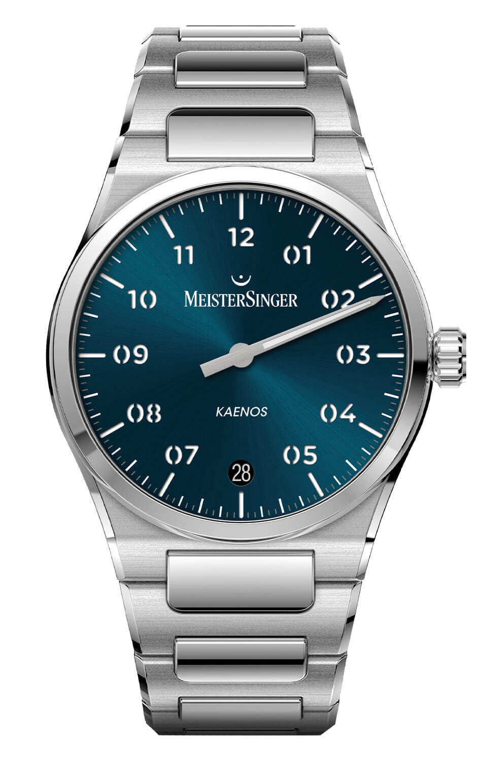MeisterSinger Kaenos KS939 je model, který redefinuje pojem klasických pánských hodinek, překračuje zažité stylistické konvence. Design založený na principu jednoručkového zobrazení umožňuje pohlížet na čas jinak – ne jako na sled vteřin, ale jako na prostor k využití. Modrý ciferník s matným povrchem a precizně vytištěnou minutovou stupnicí si zachovává čitelnost i přes nestandardní formu, zatímco charakteristická jehlová ručička se pohybuje plynule, což přináší přirozený rytmus při odečítání času.