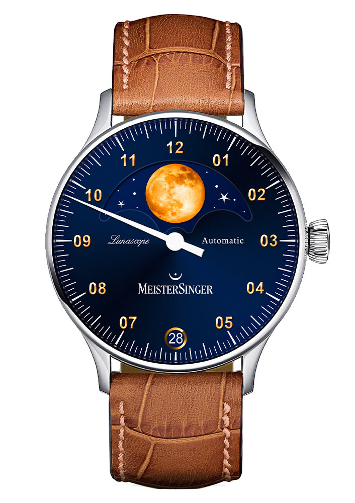 Pánské hodinky MeisterSinger Lunascope LS908G . Inspirativní model navíc vybavený krásně vyobrazenými fázemi měsíce. Duhově modrý ciferník dokonale kontrastuje s barvou oblohy, která je pozadím v okénku fáze Měsíce, barvou ručičky, indexy a dokonce i datumovým okénkem! Poslední jmenovaný dostal také ocelový rám, vyleštěný do vysokého lesku, aby zdůraznil eleganci a dotvořil prestižní image.
