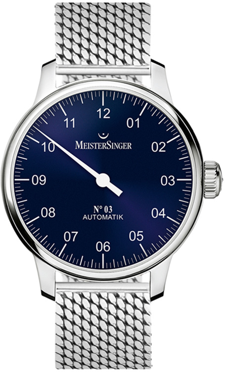 Machine v modelu No.03 generuje energii v rytmu mechanismu a automaticky přitahuje svým kouzlem. Neuvěřitelně elegantní švýcarské hodinky s velmi přehledným ciferníkem s arabskými indexy v sytě modré barvě. Pouzdro vyrobené z nejkvalitnější nerezové oceli o průměru 43 mm bylo uzavřeno skleněným zadním krytem, odhalujícím krásně zdobený automatický Machineek. Stejně jako všechny modely MeisterSinger i tento ukazuje čas pouze jednou rukou. Ciferník má 12hodinovou stupnici s indexy v 5minutových intervalech. Tyto klasické hodinky mají milánský náramek z nerezové oceli, který je velmi odolný a pohodlný na nošení.