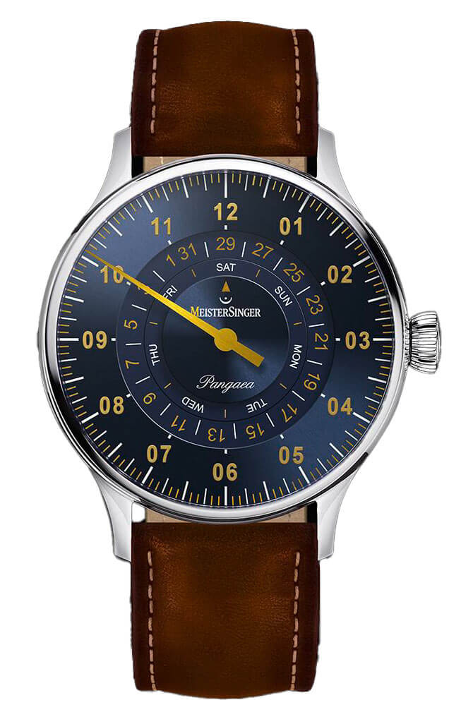 Ve světě plném spěchu a neustálého odpočítávání sekund přináší pánské hodinky MeisterSinger Pangaea Day Date PDD917G novou filozofii vnímání času – klid, přesnost a harmonii. Jejich minimalistická koncepce, zaměřená na to, co je skutečně důležité, je esencí moderní elegance. Tyto hodinky vynikají výjimečným ciferníkem v hlubokém odstínu modré, na kterém zlaté indexy a ručička vytvářejí harmonický kontrast. Unikátní systém jediné ručičky způsobuje, že čas plyne pomaleji a umožňuje soustředit se na přítomný okamžik, nikoli na každou ubíhající sekundu.