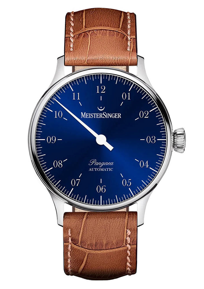 Na přední straně hodinek je tvrdé a vysoce odolné safírové sklíčko - chrání Má modrý ciferník v jemném retro stylu. Samotný ciferník je již dříve zmíněným oceňovaným systémem ukazování času jednou rukou. Má hodinovou a minutovou stupnici a jednu ručku.Číselník zdobí hrdé logo značky MeisterSinger na dvanácté hodině a název kolekce Pangea s elegantním fontem na šesté hodině spolu s nápisem „AUTOMATIC“. Prezentovaný model je skvělou nabídkou elegantních hodinek, které budou dokonalým doplňkem každého pánského šatníku.