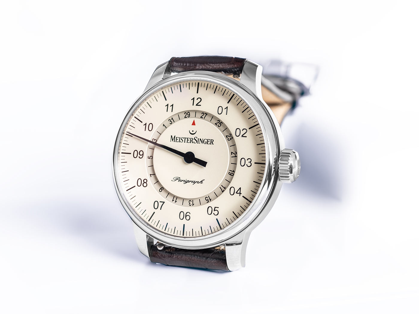 MeisterSinger představuje pánské hodinky Perigraph BM1103 o průměru 38 mm vyrobené z nerezové oceli 316L. Na pravé straně hodinek je korunka pro ovládání tohoto unikátního modelu. Hodinky jsou doplněny elegantním hnědým koženým řemínkem. Je měkký a lehký, což zajišťuje pohodlí při jeho používání. Na zadní straně je průhledné víko, díky kterému můžete obdivovat práci automatu Sellita SW300 poháněného pohybem zápěstí. Strojek vybavený rezervou chodu až cca 42 hodin je osvědčeným systémem, který zaručuje dokonalé měření času a funkci data.