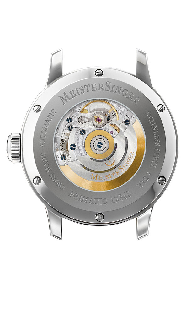 Primatic má také vnější prstenec ciferníku. Dodává ciferníku hloubku a výjimečně šik charakter. S pouzdrem 41,5 mm a novou funkcí MeisterSinger působí Primatic mohutným dojmem, ale přesto padne na každé zápěstí. Stejně jako většina hodinek MeisterSinger je švýcarský Machineek při jeho precizní práci vidět přes skleněný displej na zadní straně. Tím je zajištěno, že pouhé pohyby paží uživatele způsobí, že rotor pomocí ozubeného soukolí v malých krocích automaticky navíjí pružinu. Tímto způsobem může SW270 Primatic akumulovat až 38 hodin rezervy chodu zcela nepostřehnutelným způsobem.