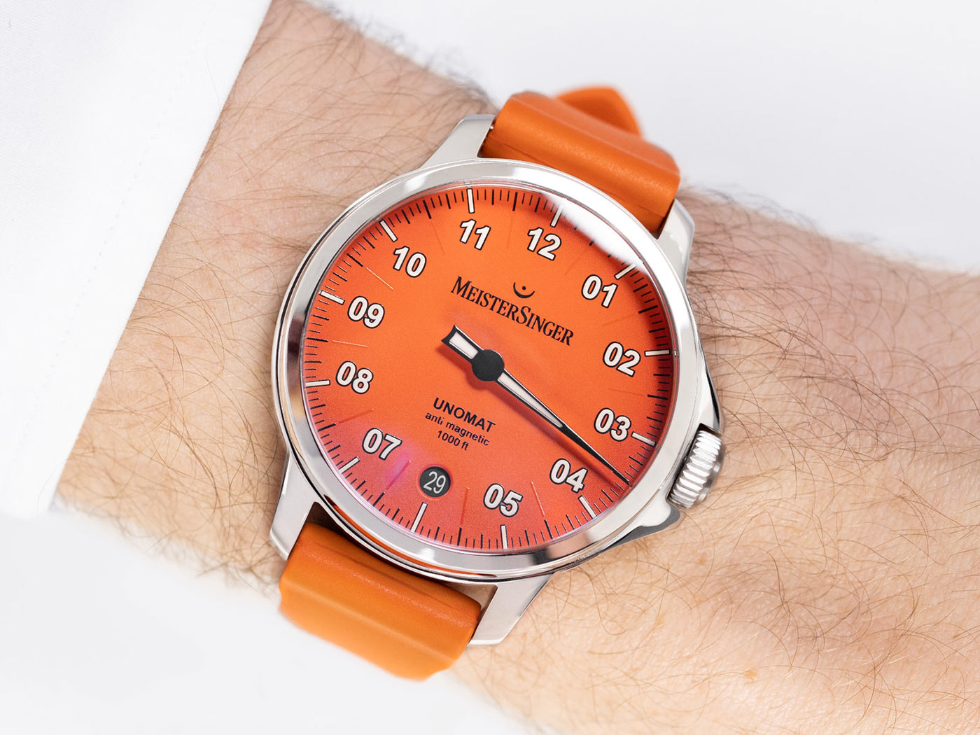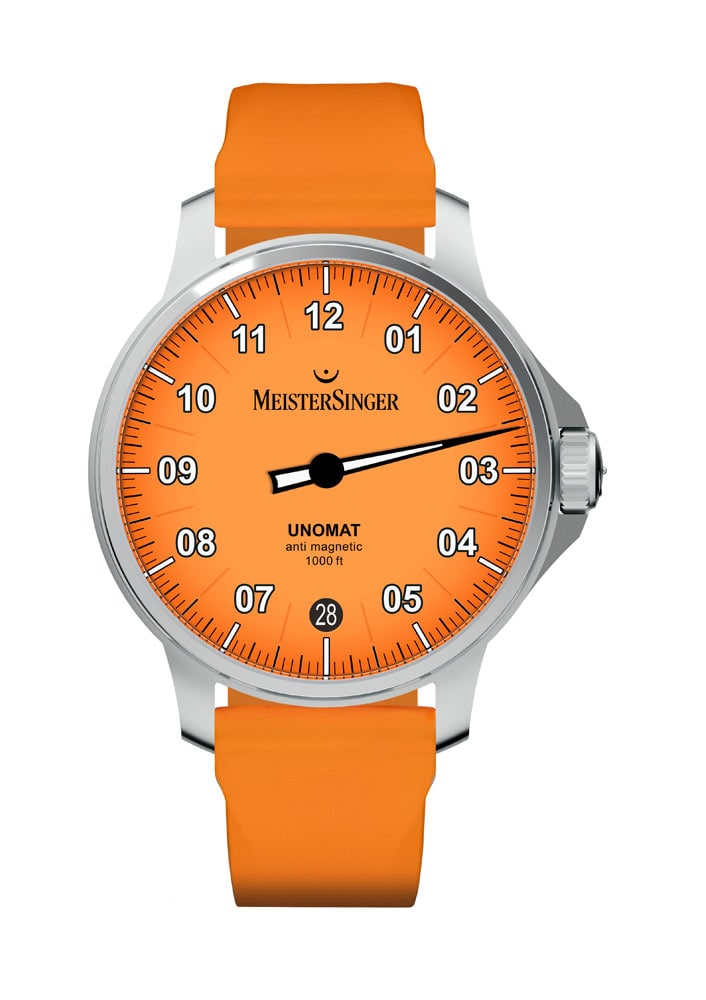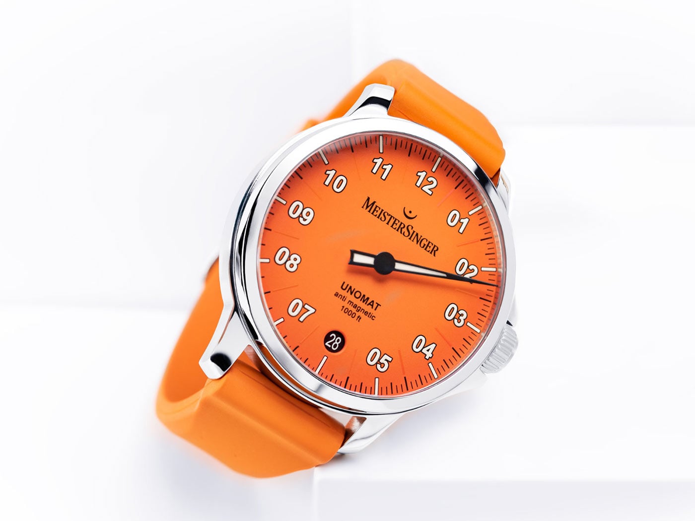 Limitované jednoručičkové pánské hodinky MeisterSinger Unomat Limited Edition ED-UN915. Striktně limitovaná edice skládající se z 50 kusů v energické světle oranžové barvě stimulující aktivní život a dobrou letní náladu.