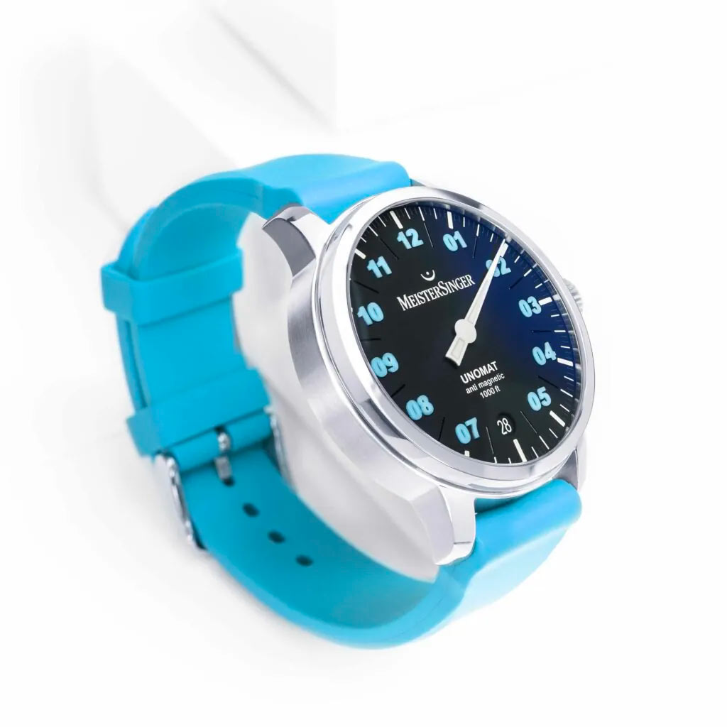 Referenční číslo UN902BLU je vyrobeno tak, aby vydrželo drsné podmínky a nikdy se nevzdalo. K tomuto účelu bylo vytvořeno odolné nerezové pouzdro o průměru 43 mm. Má pevné bočnice, které chrání šroubovací korunku proti otřesům a nárazům. Jeho uši se hladce integrují s elastickým páskem se zapínáním na přezku. Krásný řemínek Arctic Blue je pružný a krásně padne na zápěstí. Pánské hodinky MeisterSinger Unomat jsou dokonalým společníkem při plavání a potápění. Jeho třída těsnosti byla hodnocena na 300 metrů.