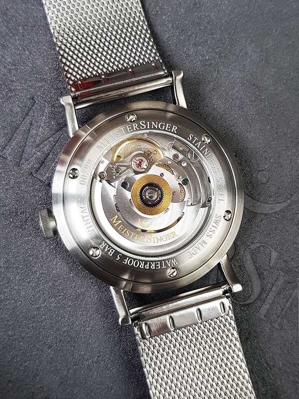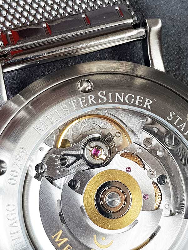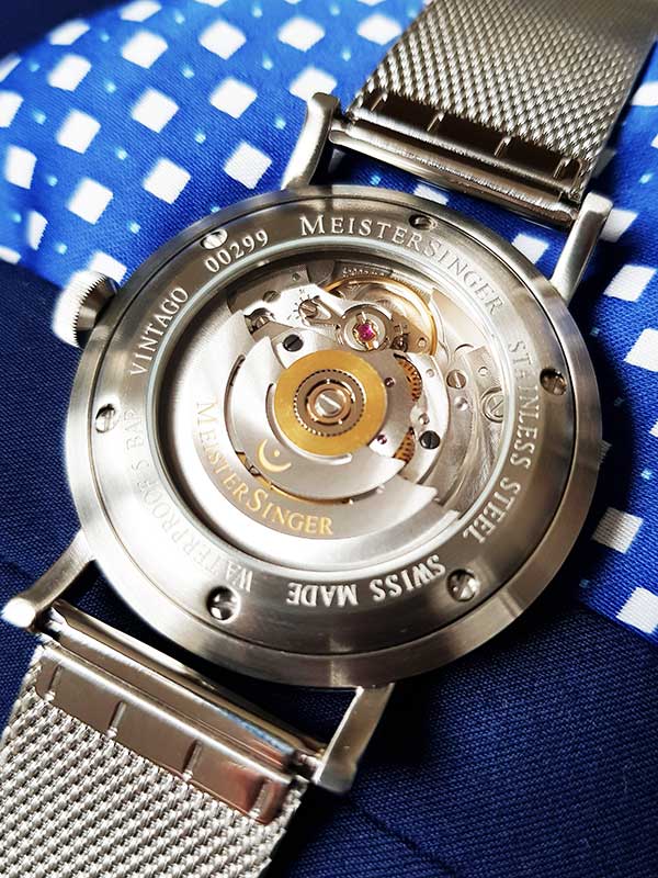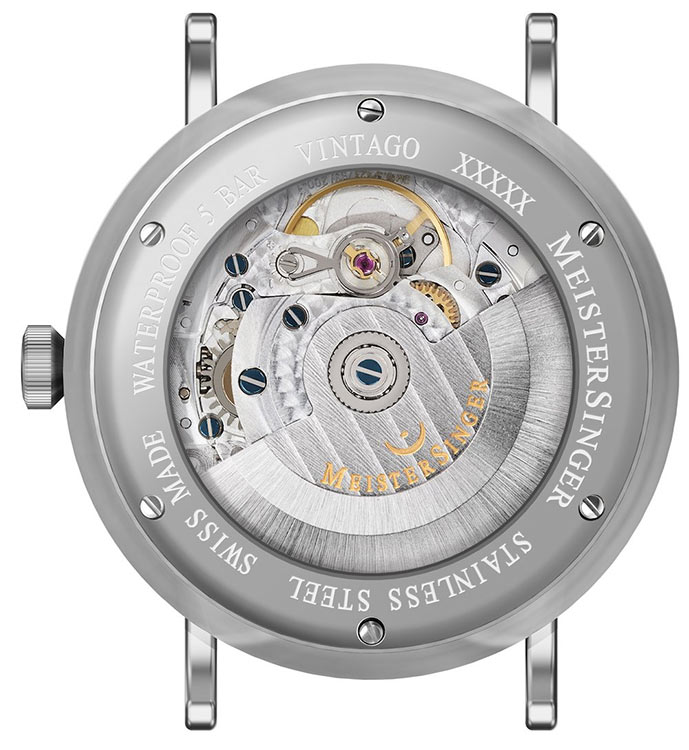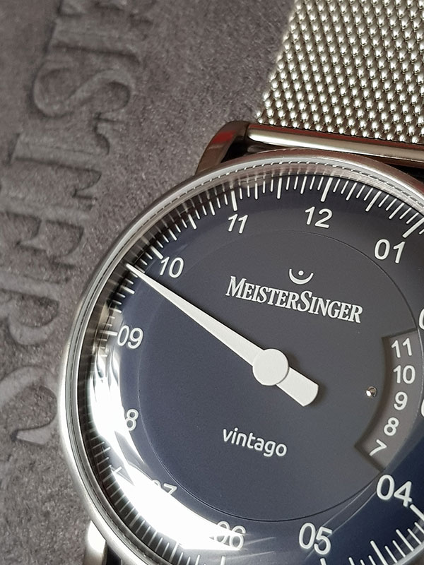 Vnitřek ciferníku MeisterSinger Vintago byl mírně vyvýšen, což pod sklem vytváří mírně klenutý efekt. Vpravo můžete vidět datumové okno, které trvá téměř 2 až 4 hodiny. Hodinové značky tištěné dvoumístným způsobem (01, 02, 03 atd.) jsou společným tématem většiny číselníků MeisterSinger. Srdcem hodinek je švýcarský a oceňovaný automatický Machineek Sellita SW200-1 .