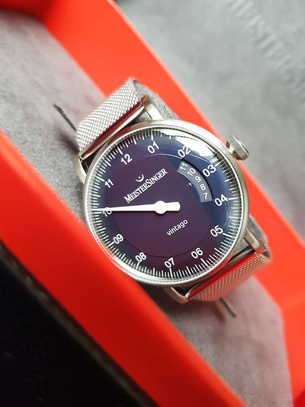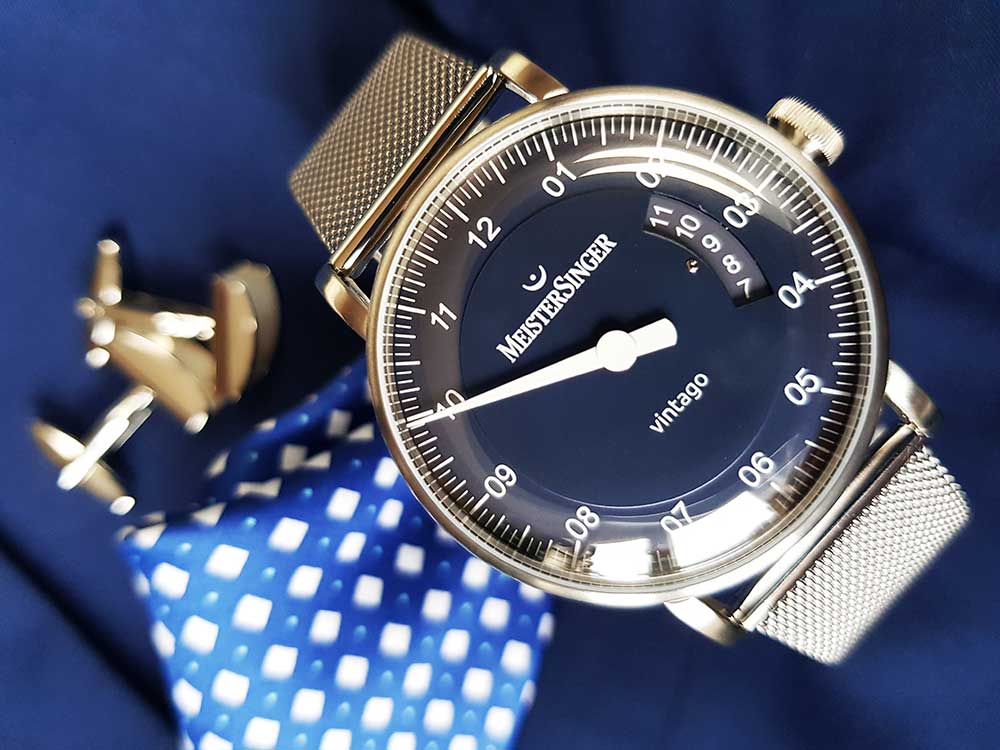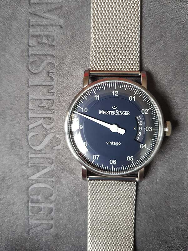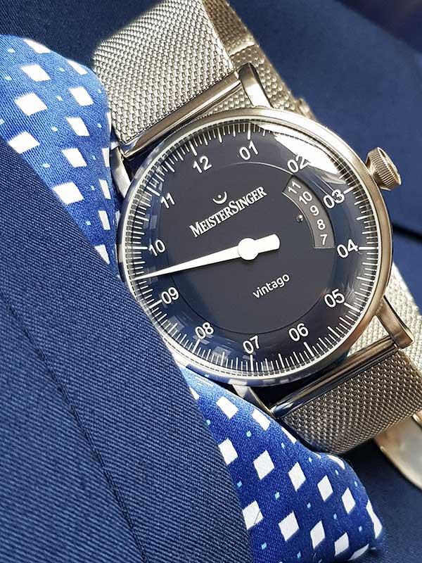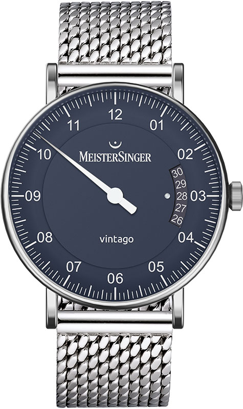 Hodinky Meistersinger Vintago VT908-MLN20 . Jak název napovídá, Meistersinger se ohlíží zpět na Vintago, protože ztělesňuje designové přednosti velmi elegantní éry. Čistě funkční typografie, mírně klenuté sklo evokuje strohý designový jazyk 60. let, pro toto desetiletí je také typické pouzdro z broušené nerezové oceli a decentní průměr 38 mm. A konečně, pečlivě navržená krajka také odkazuje na léta minulá.